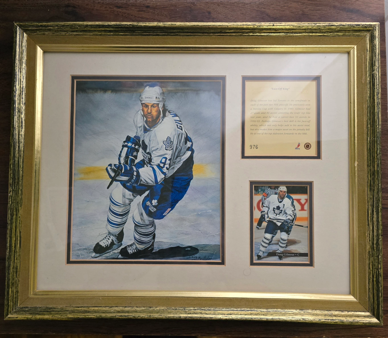 34Framed artwork featuring Doug Gilmour. Includes a large colour painting and a smaller hockey card print. In gold-coloured frame 16"×13". Reasonable offers will be taken into consideration.