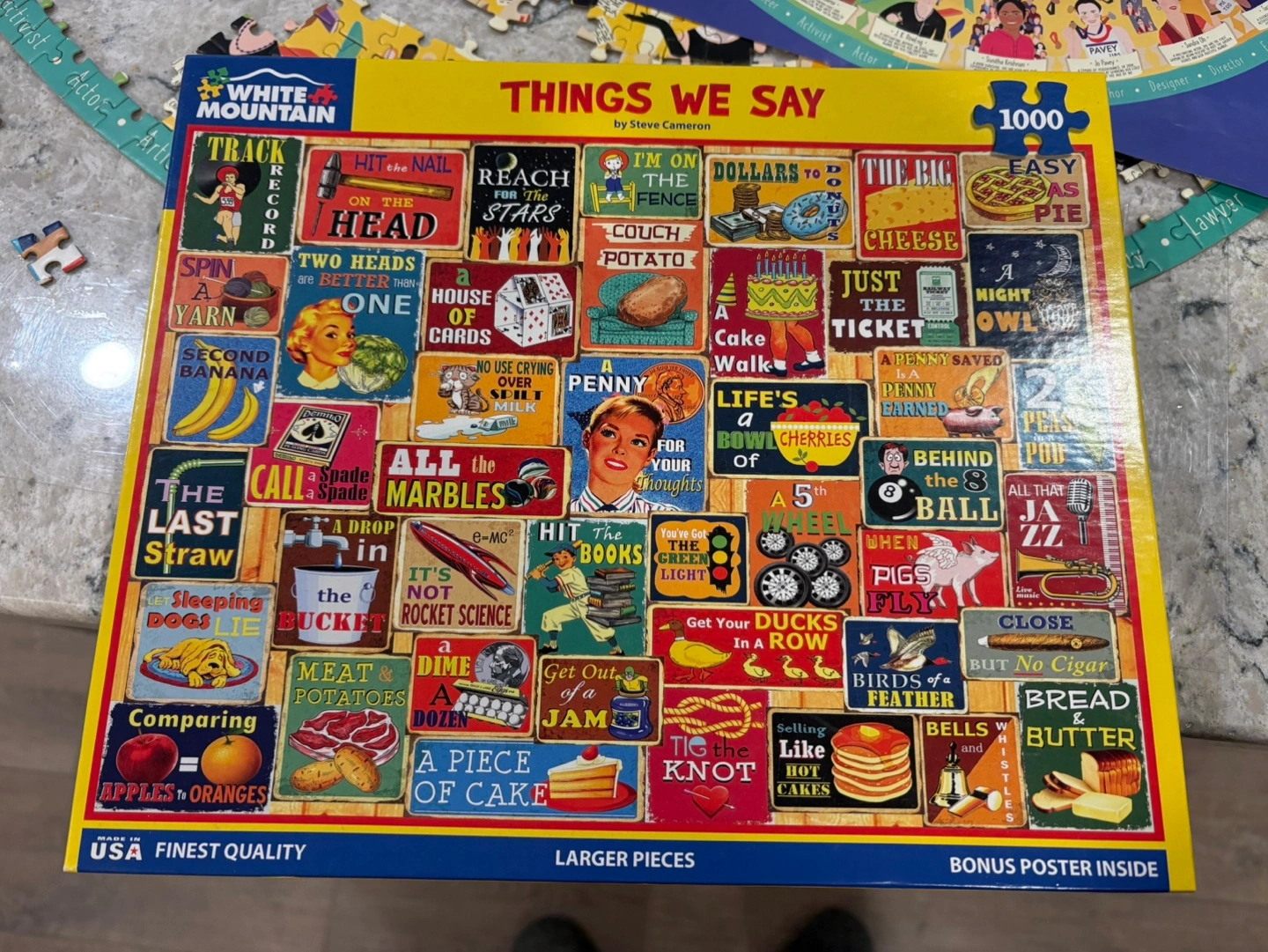 1000-piece jigsaw puzzle. Features various idioms and sayings depicted in vintage-style illustrations. Larger pieces. Bonus poster included.