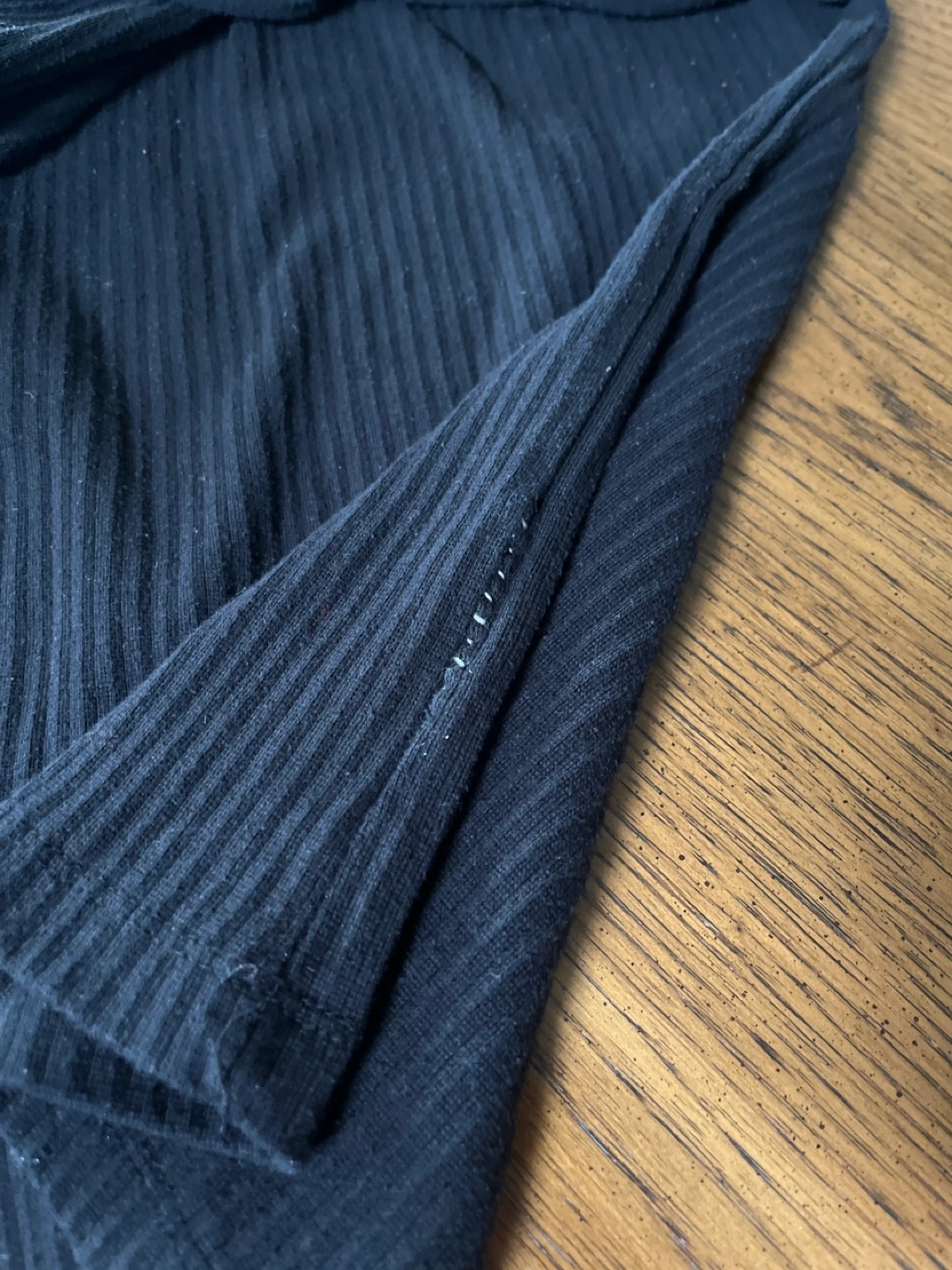 Black ribbed top with bell sleeves. Small area of mending on one seam on the body.