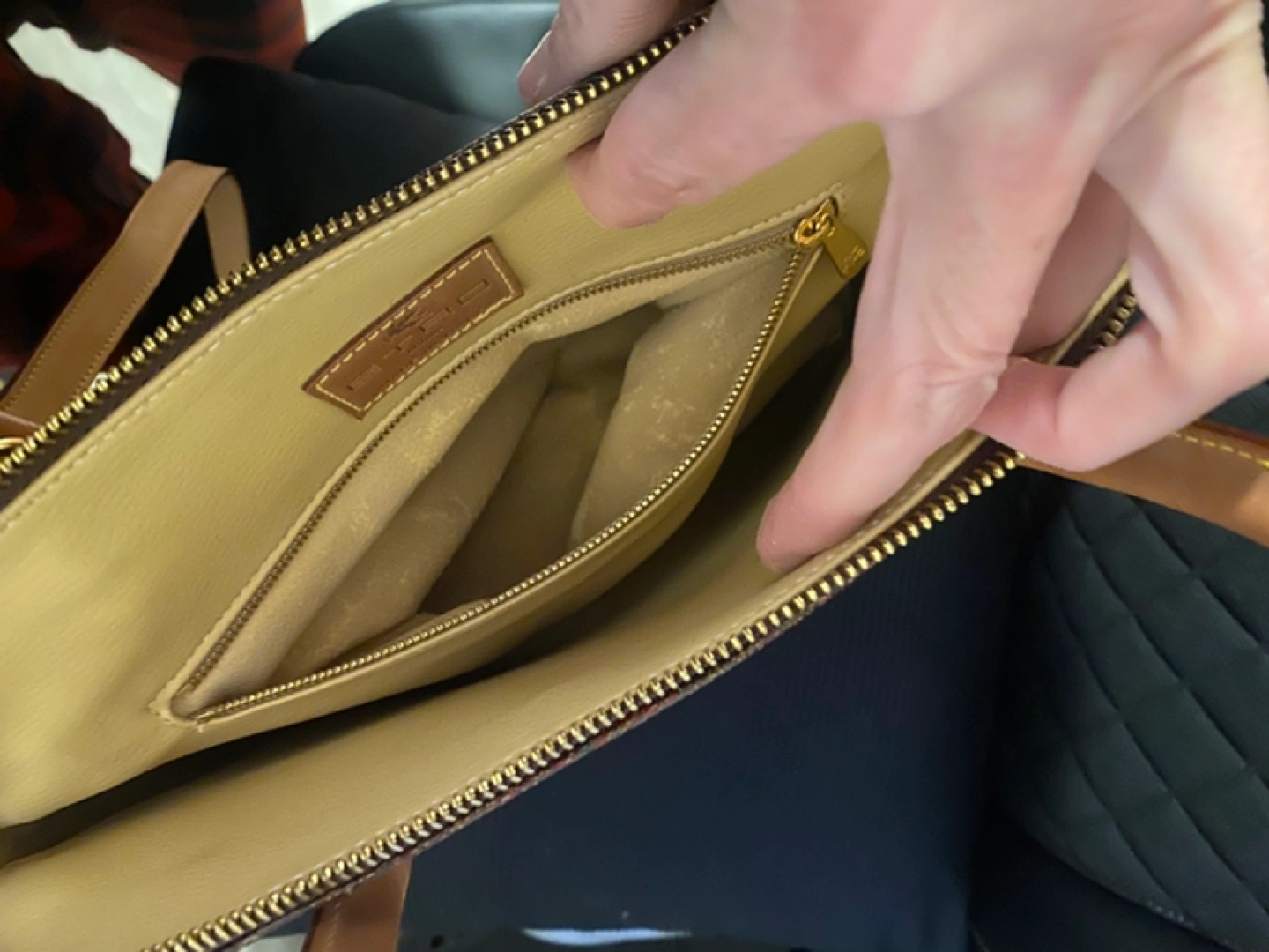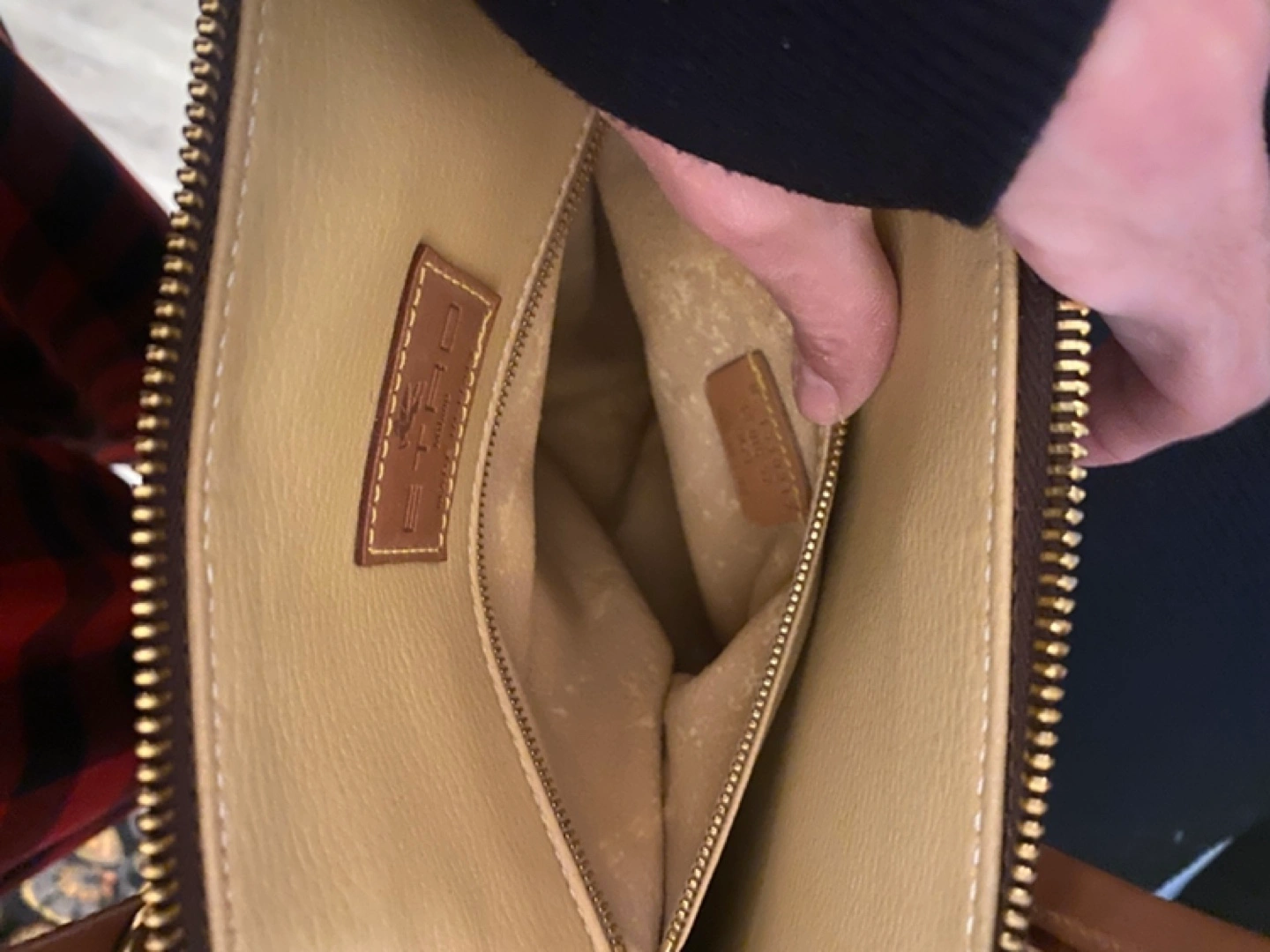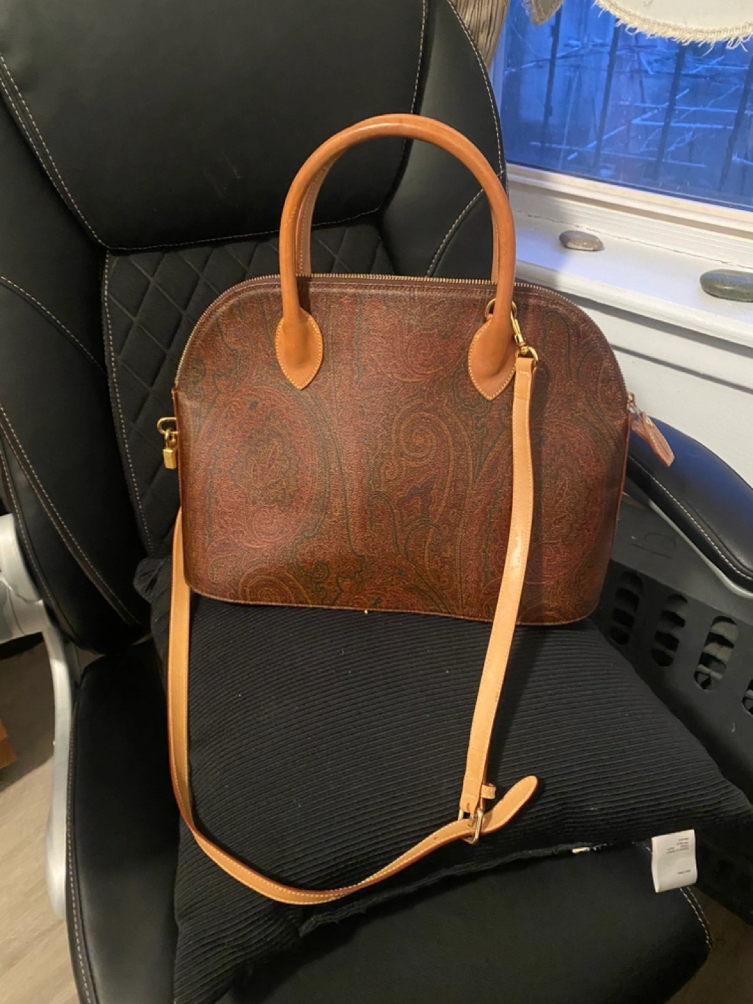 Gorgeous brown paisley patterned handbag. Top handle and long shoulder strap. Gold-tone hardware. Interior pockets. Made in Italy.