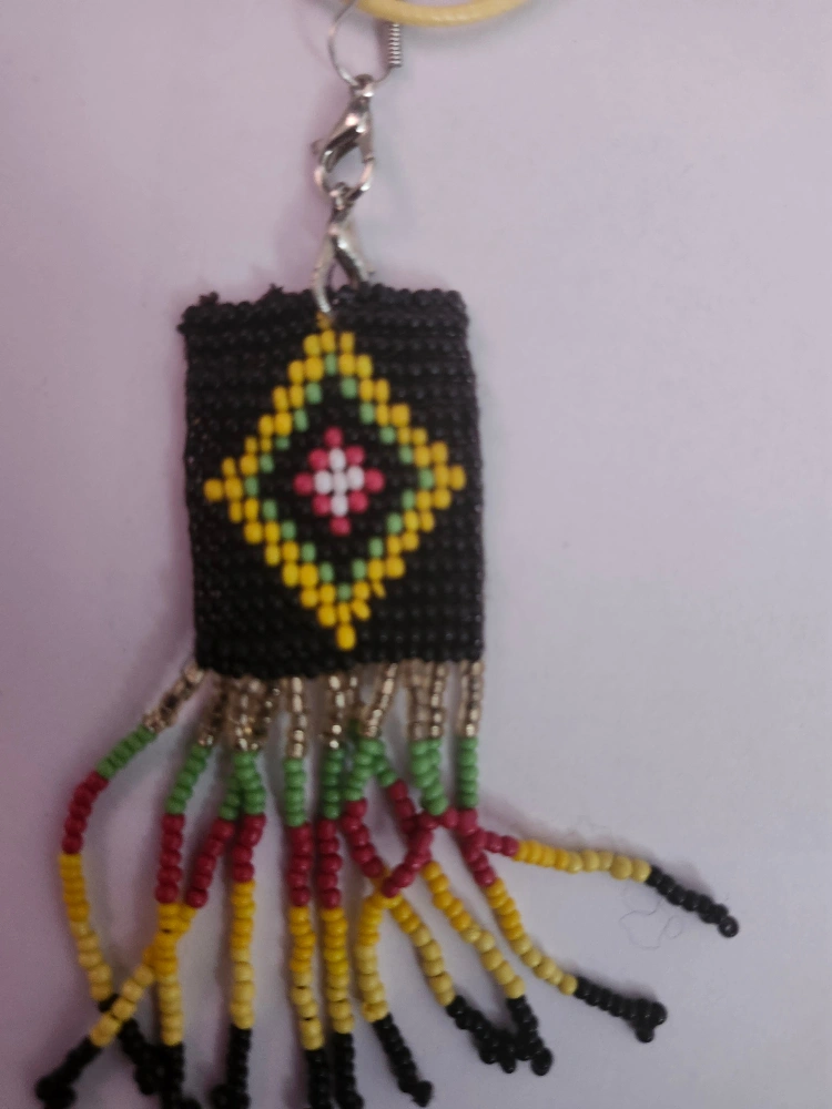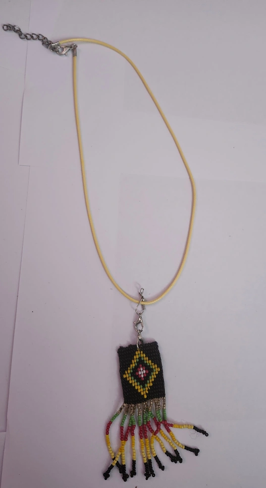 133Brand new handmade beaded necklace. Features a black beaded base with colorful embroidered design. Attached to a yellow-colored cord. 16" yellow cord with extension chain smoke free pet free