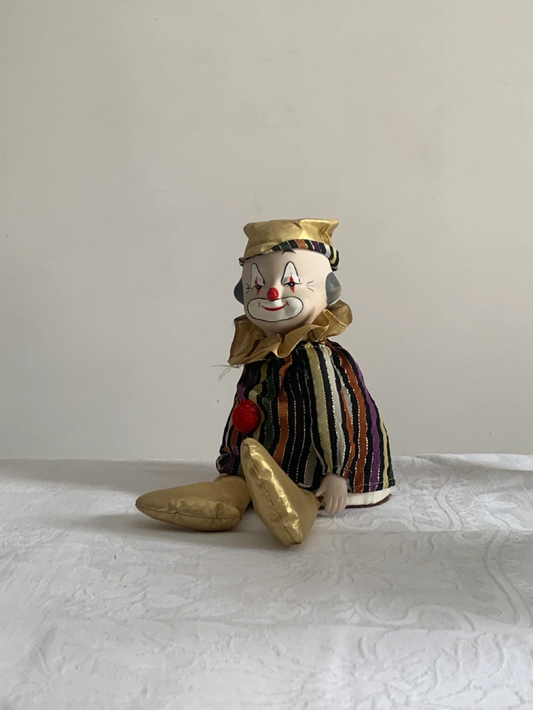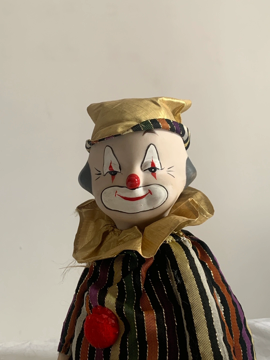 Musical clown. Collectible porcelain clown doll. Multicoloured striped outfit. Gold hat and shoes. Features a wind-up mechanism. Unique and charming. 🌺🌺 Click on my profile to see other listings you might also like. Available for pick-up (corner Laurier Ave W. / Lyon) Cash only - (e-transfers NOT possible).