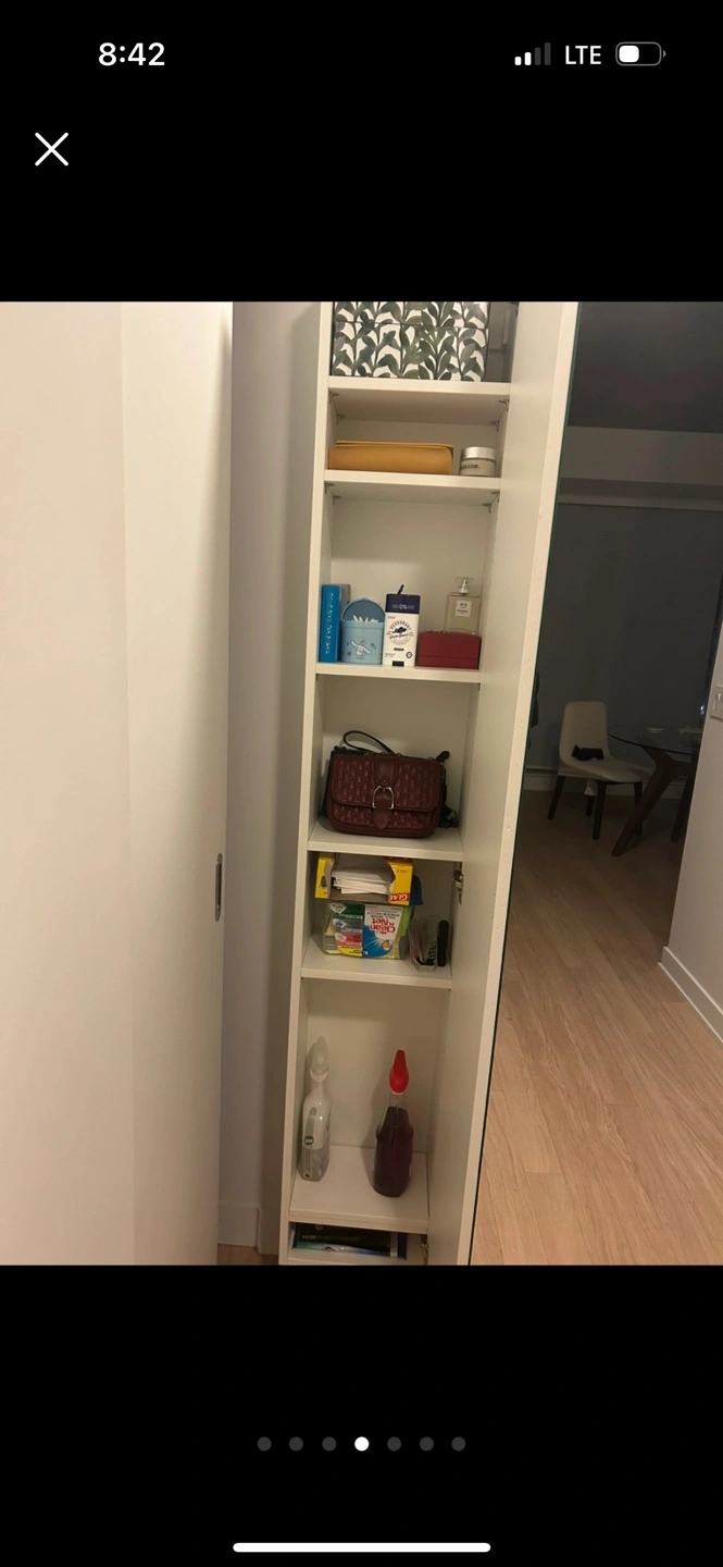 Tall white cabinet with mirrored doors. Multiple shelves inside for storage. Perfect for entryway or bedroom. Minimalist design. Metal legs. Minor wear and tear and scratches.