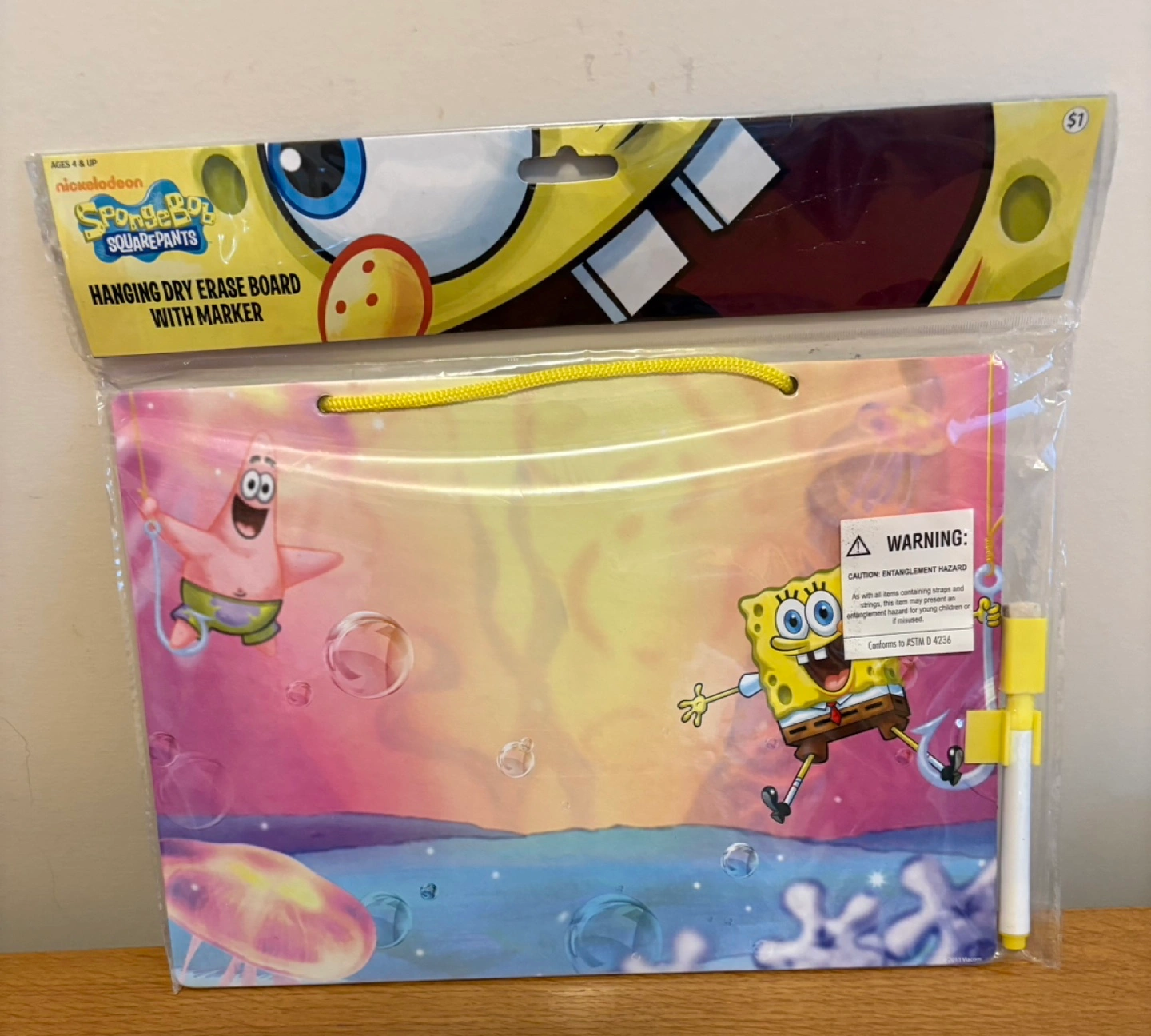 New SpongeBob Squarepants themed dry erase board. Includes marker. Hanging design. Ages 4+. In original wrapping.