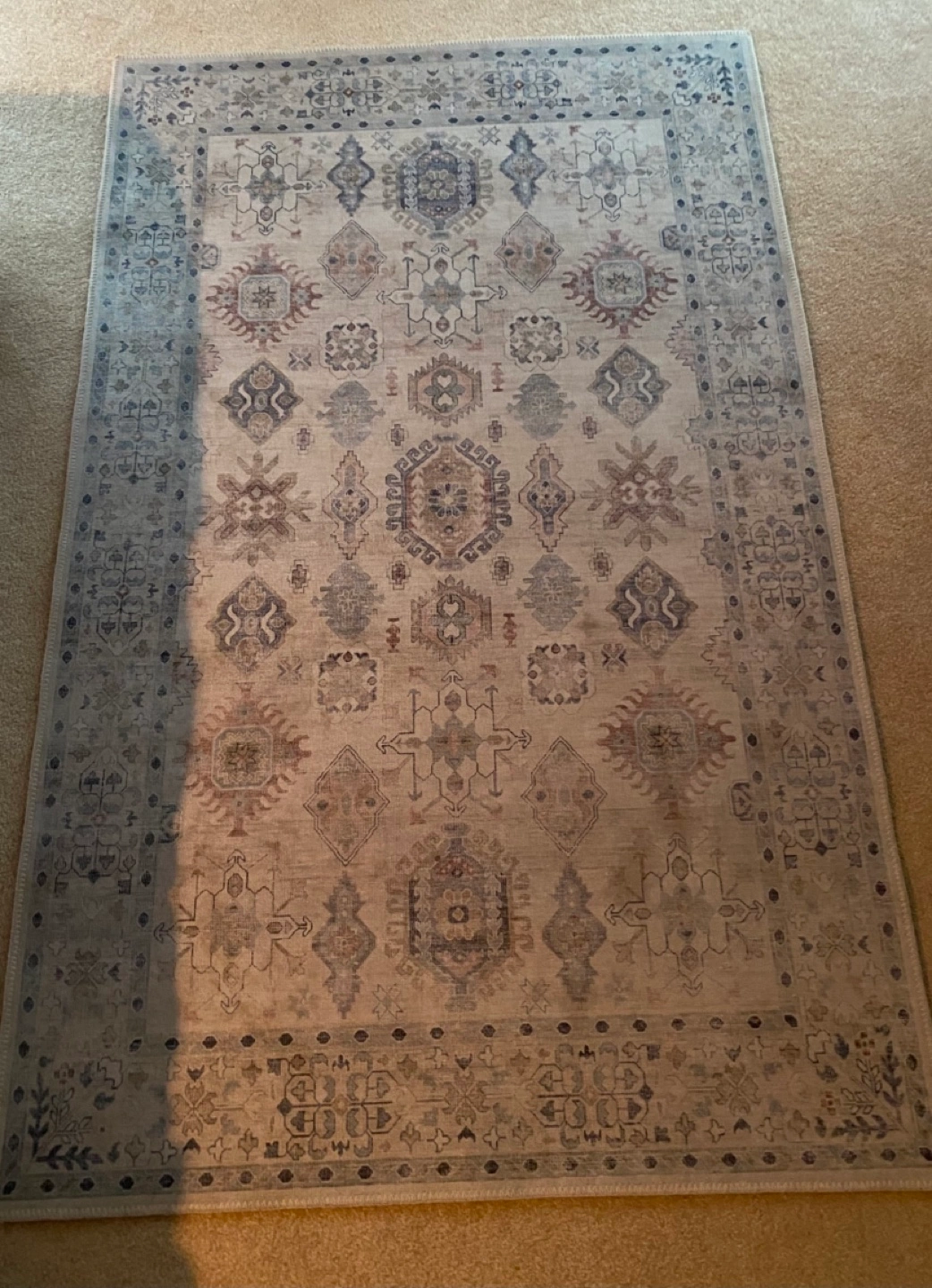 Beautiful area rug. Features a neutral colour palette with a repeating geometric pattern. Soft texture. Excellent for living room or bedroom. 5 in half feet long x 3 in half feet large (New)
