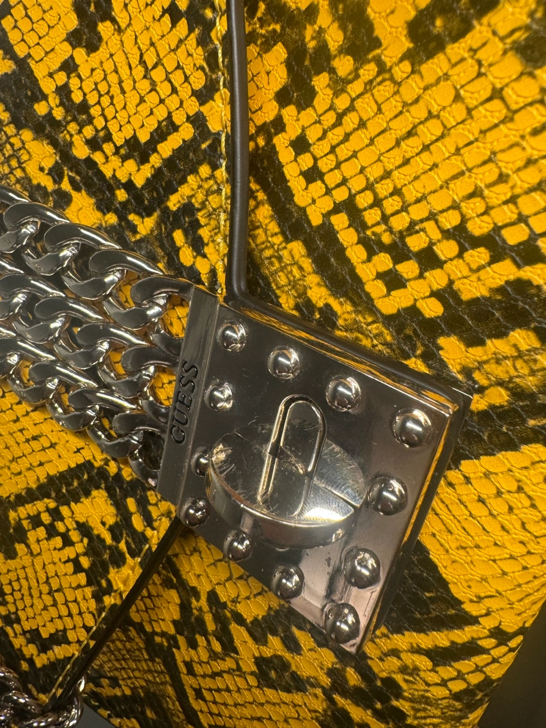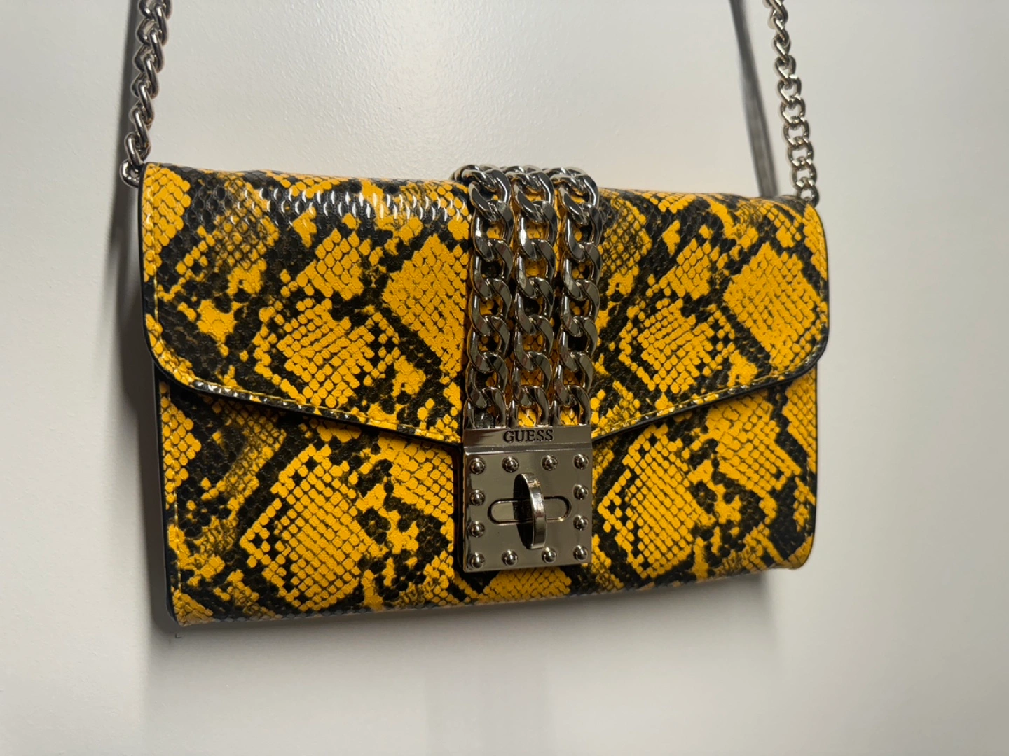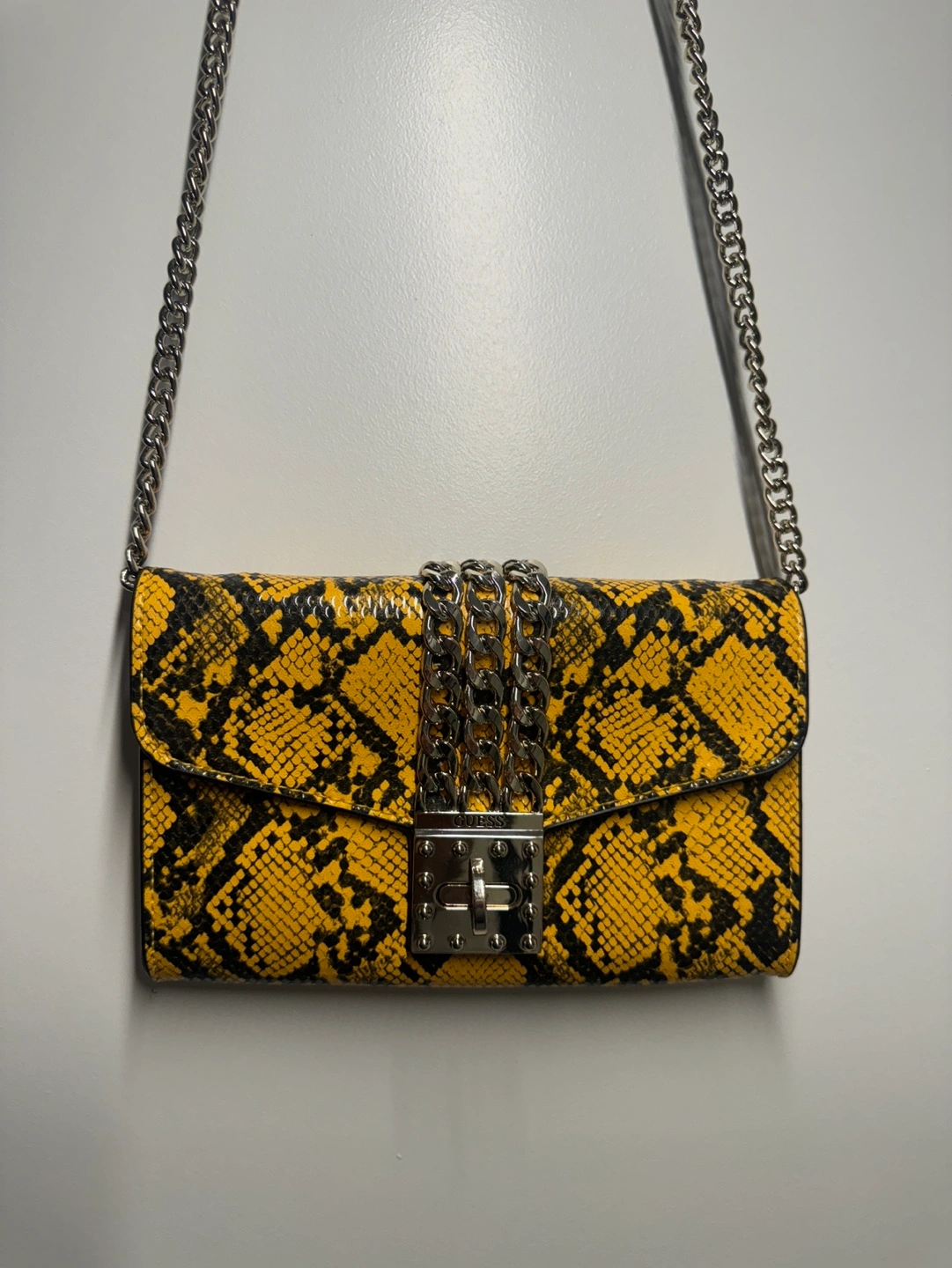 Stylish Guess crossbody bag. Features a snakeskin print, silver-toned hardware, and chain strap. Perfect for everyday use.