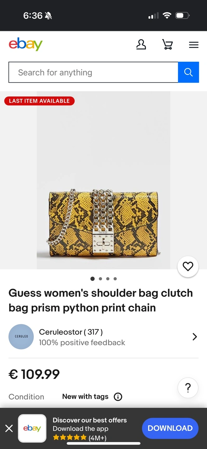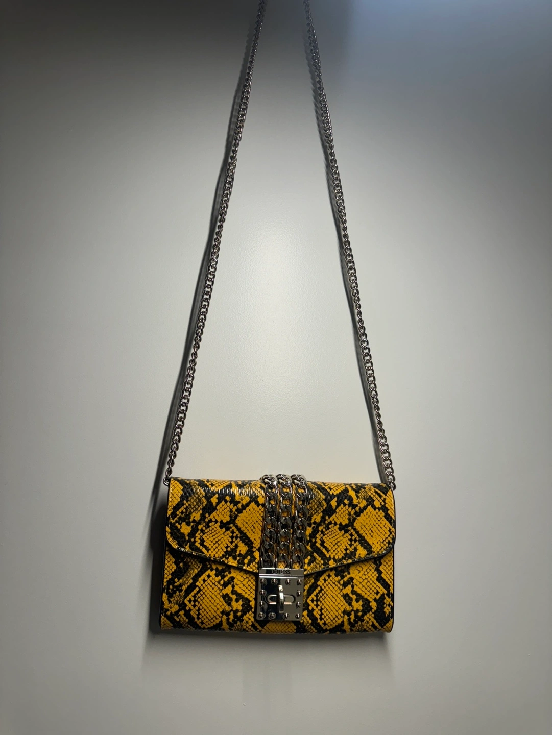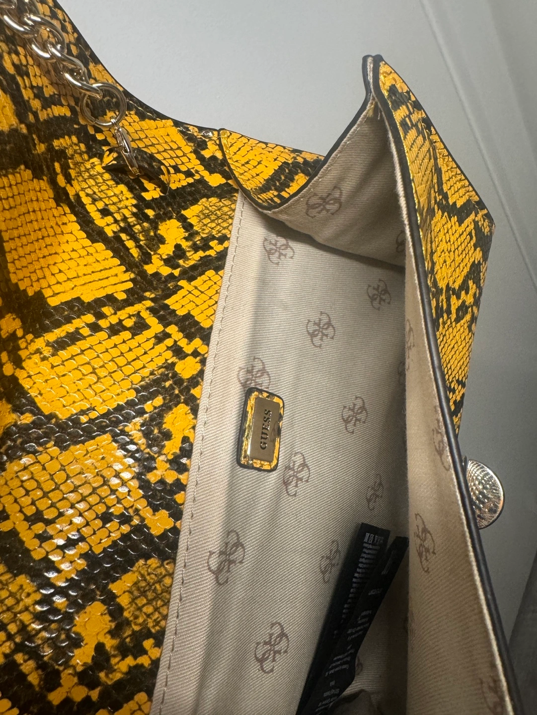 Stylish Guess crossbody bag. Features a snakeskin print, silver-toned hardware, and chain strap. Perfect for everyday use.