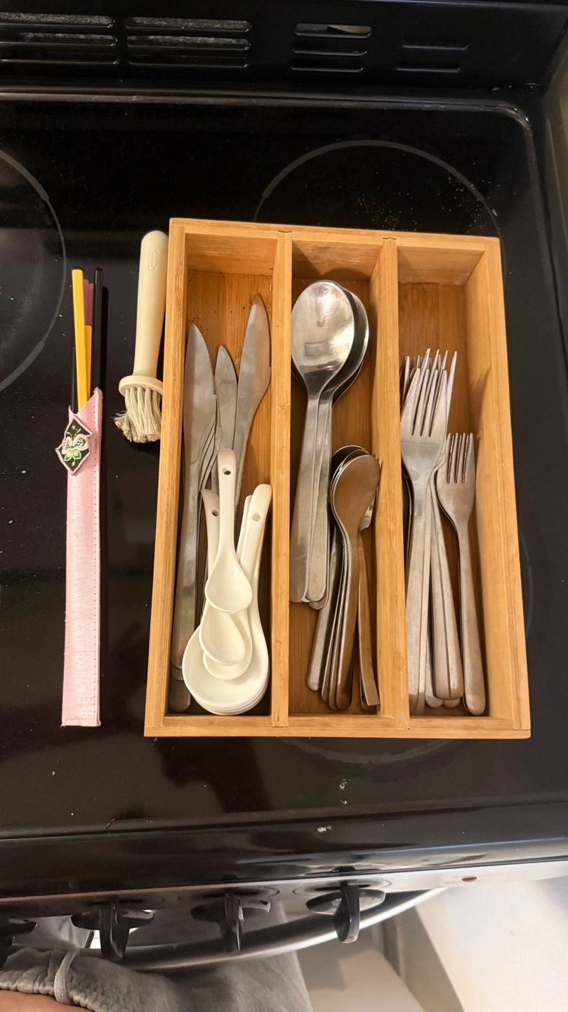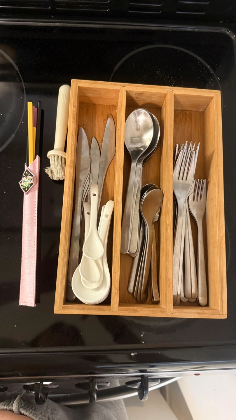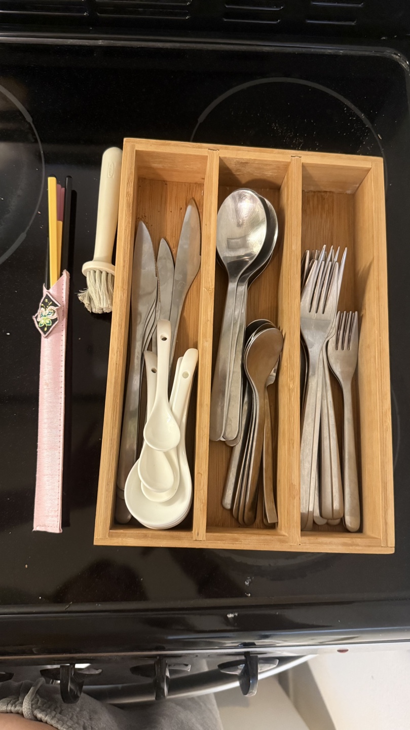 Everything you see …Bamboo cutlery organizer. Contains various spoons, forks, and knives. Also includes a pair of chopsticks in a pink case. Small cleaning brush included.
