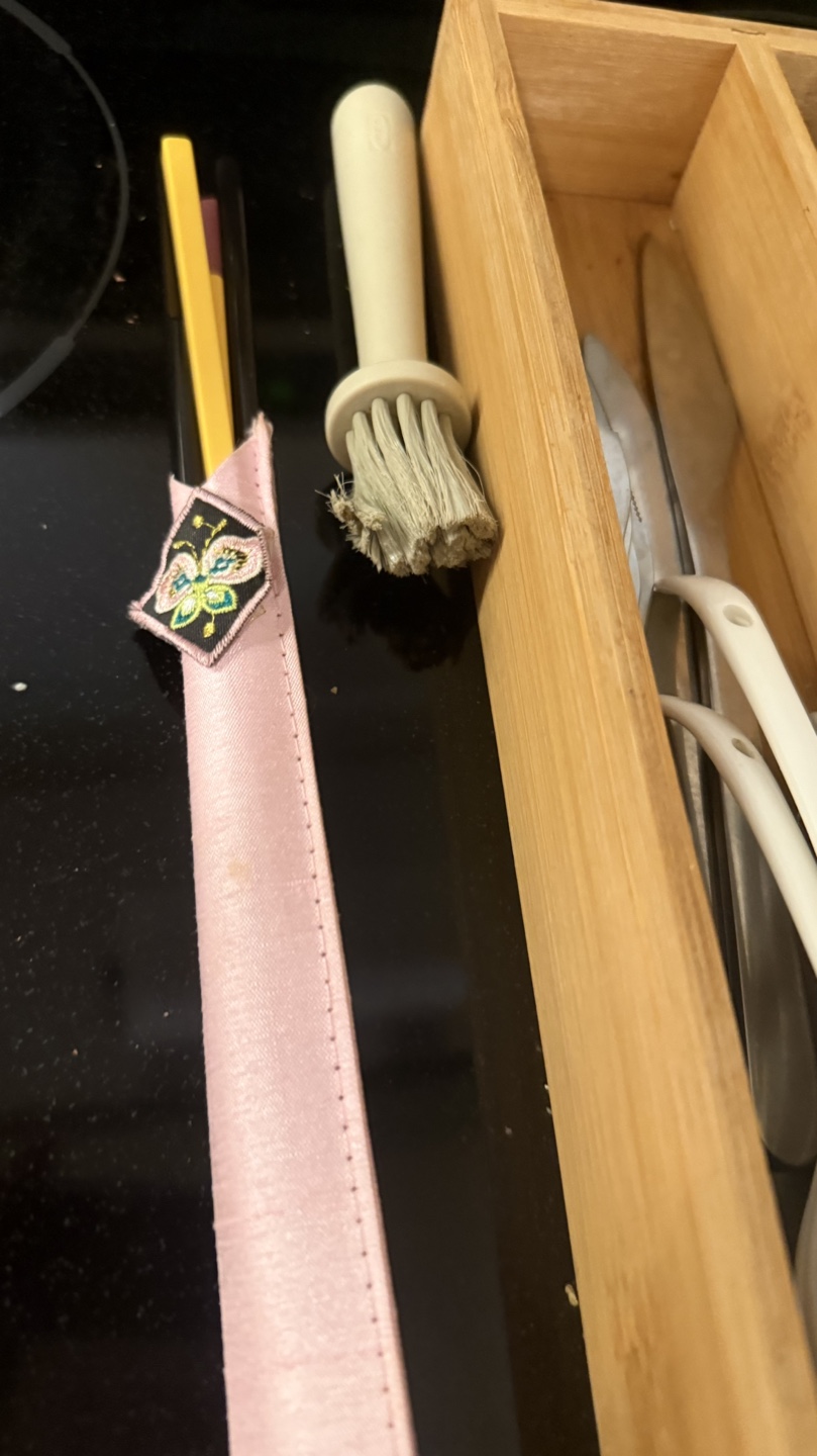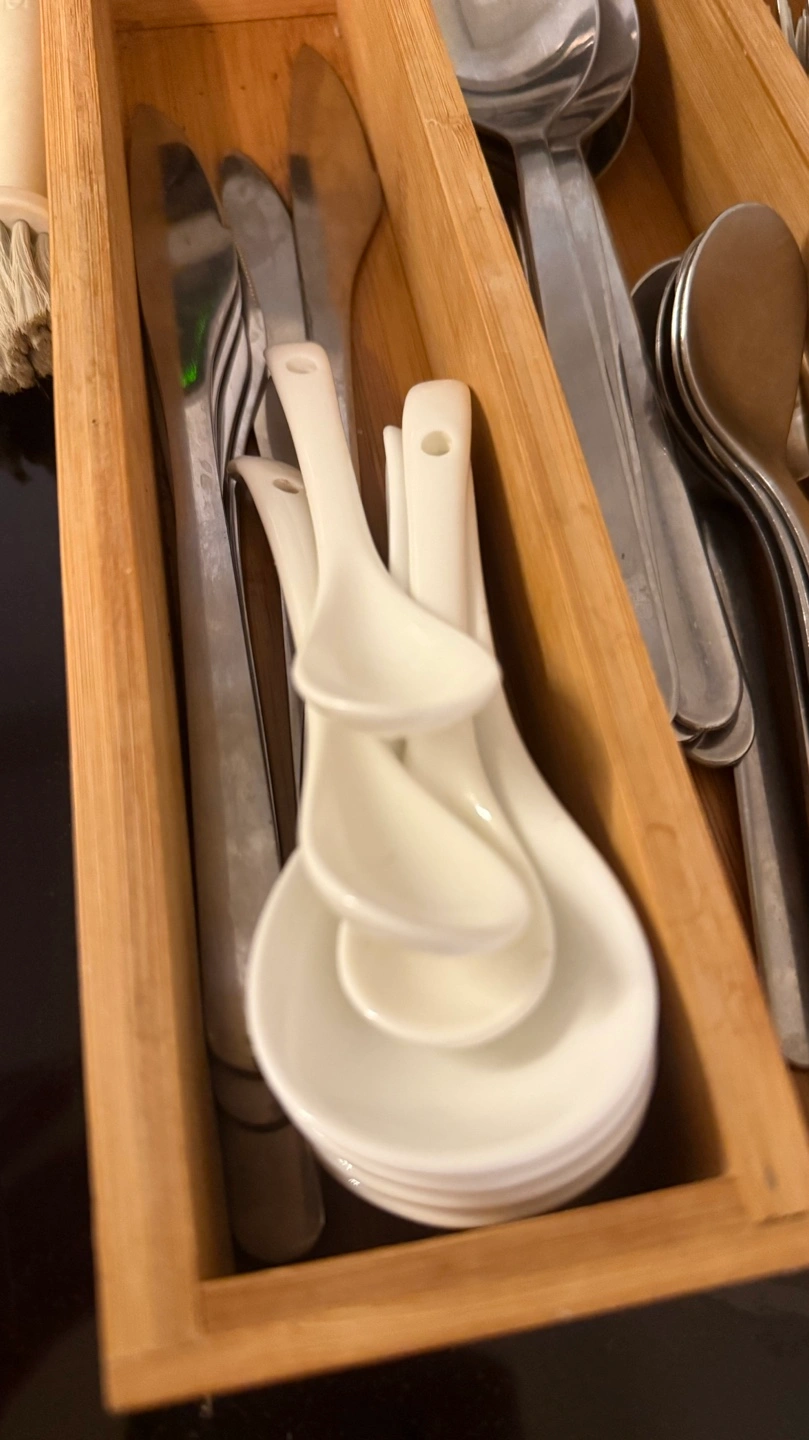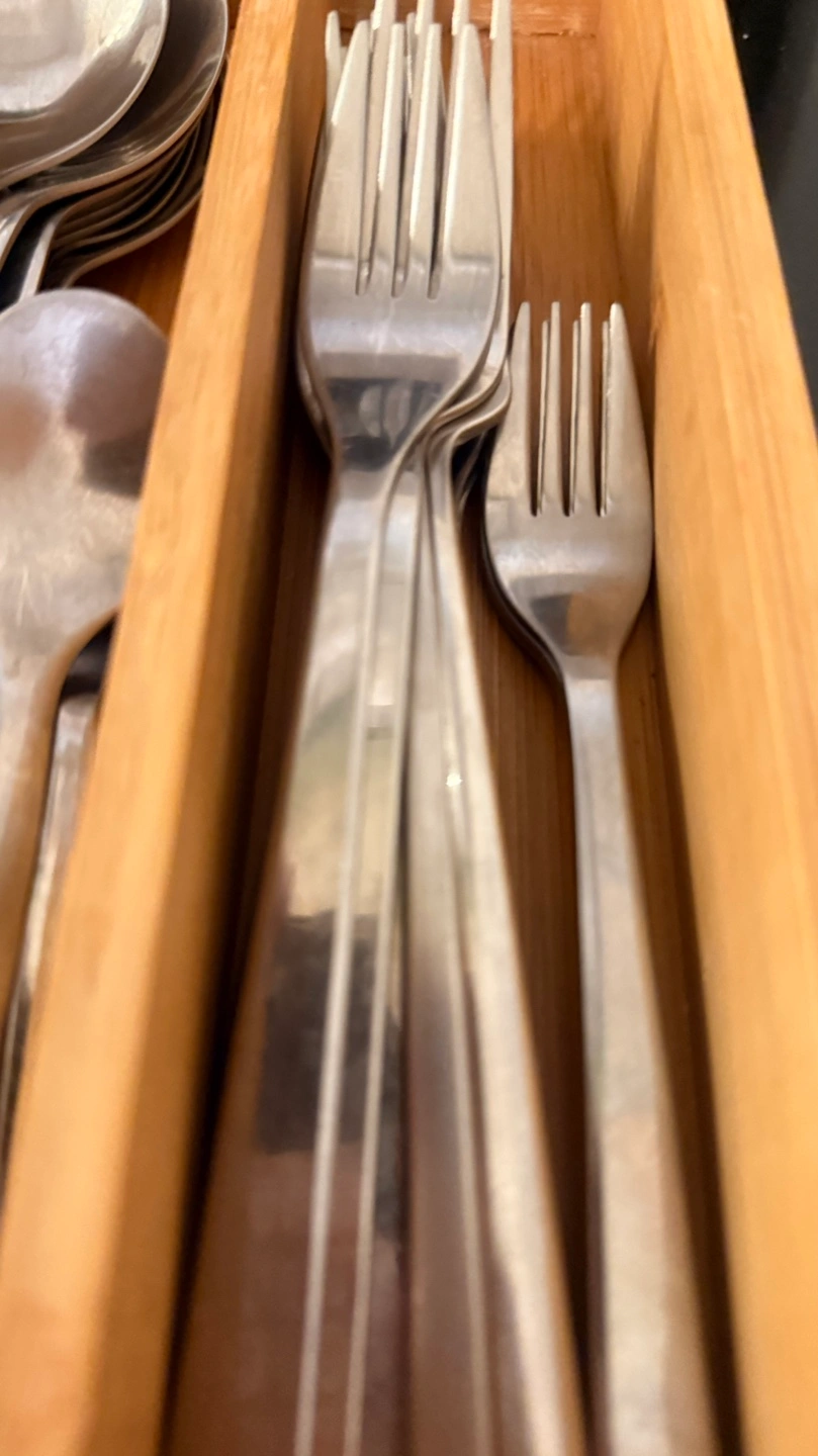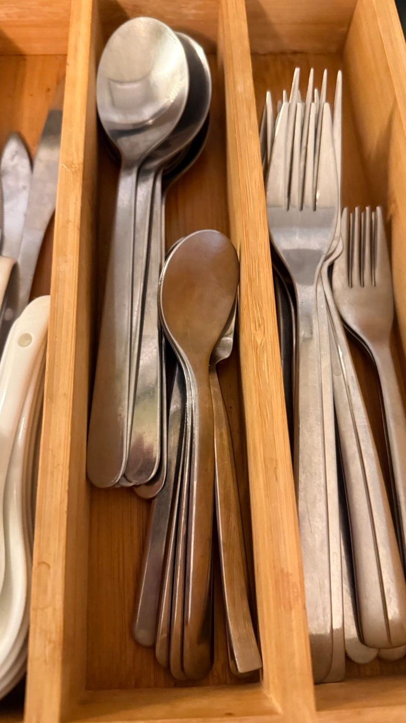 Everything you see …Bamboo cutlery organizer. Contains various spoons, forks, and knives. Also includes a pair of chopsticks in a pink case. Small cleaning brush included.