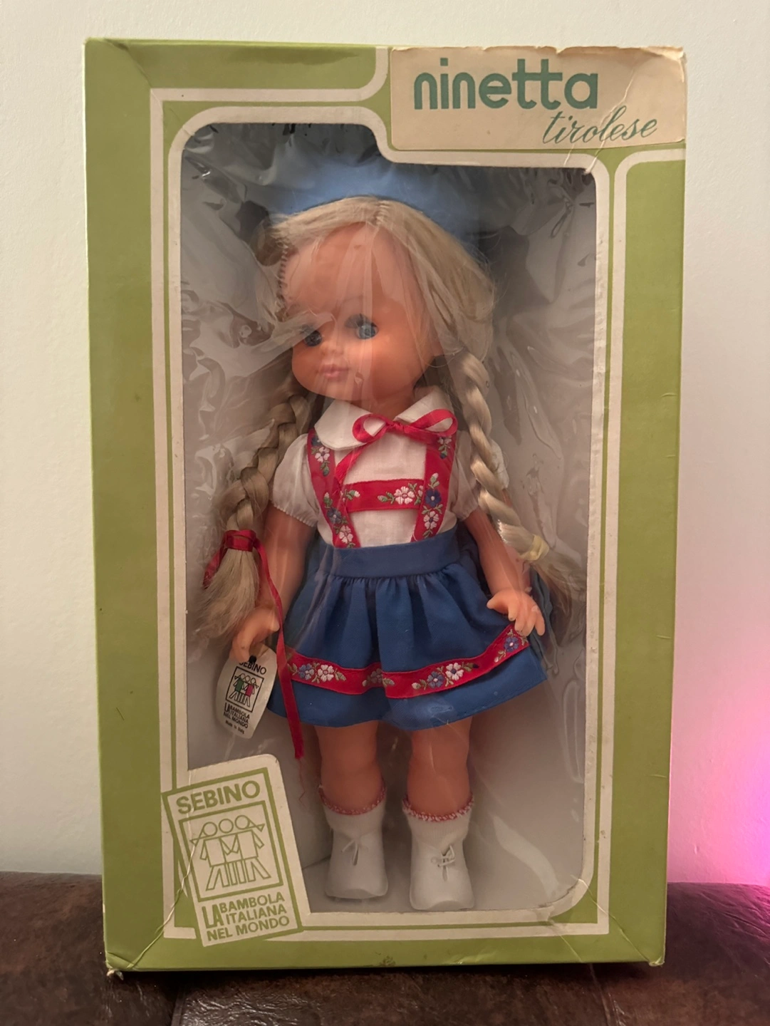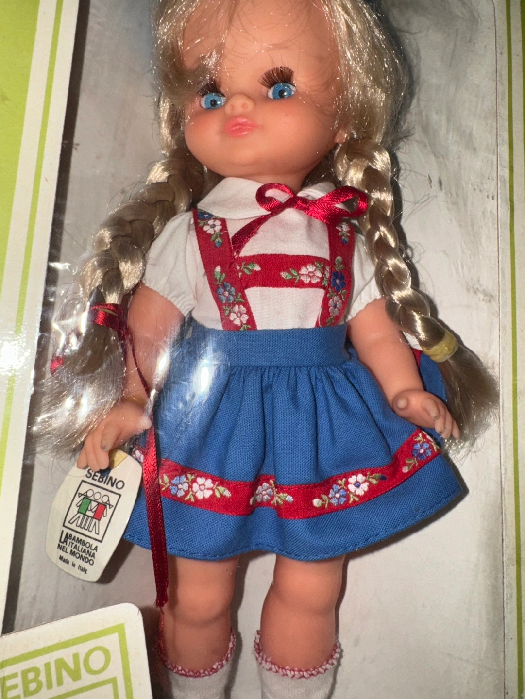Vintage Sebino Ninette Tirolese doll. Blonde hair, blue eyes. Wears traditional Tyrolean dress. Comes in original box. Made in Italy.
