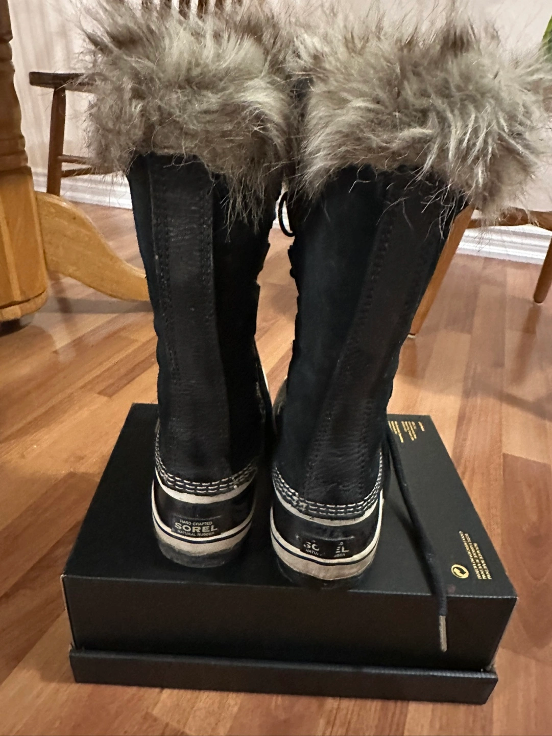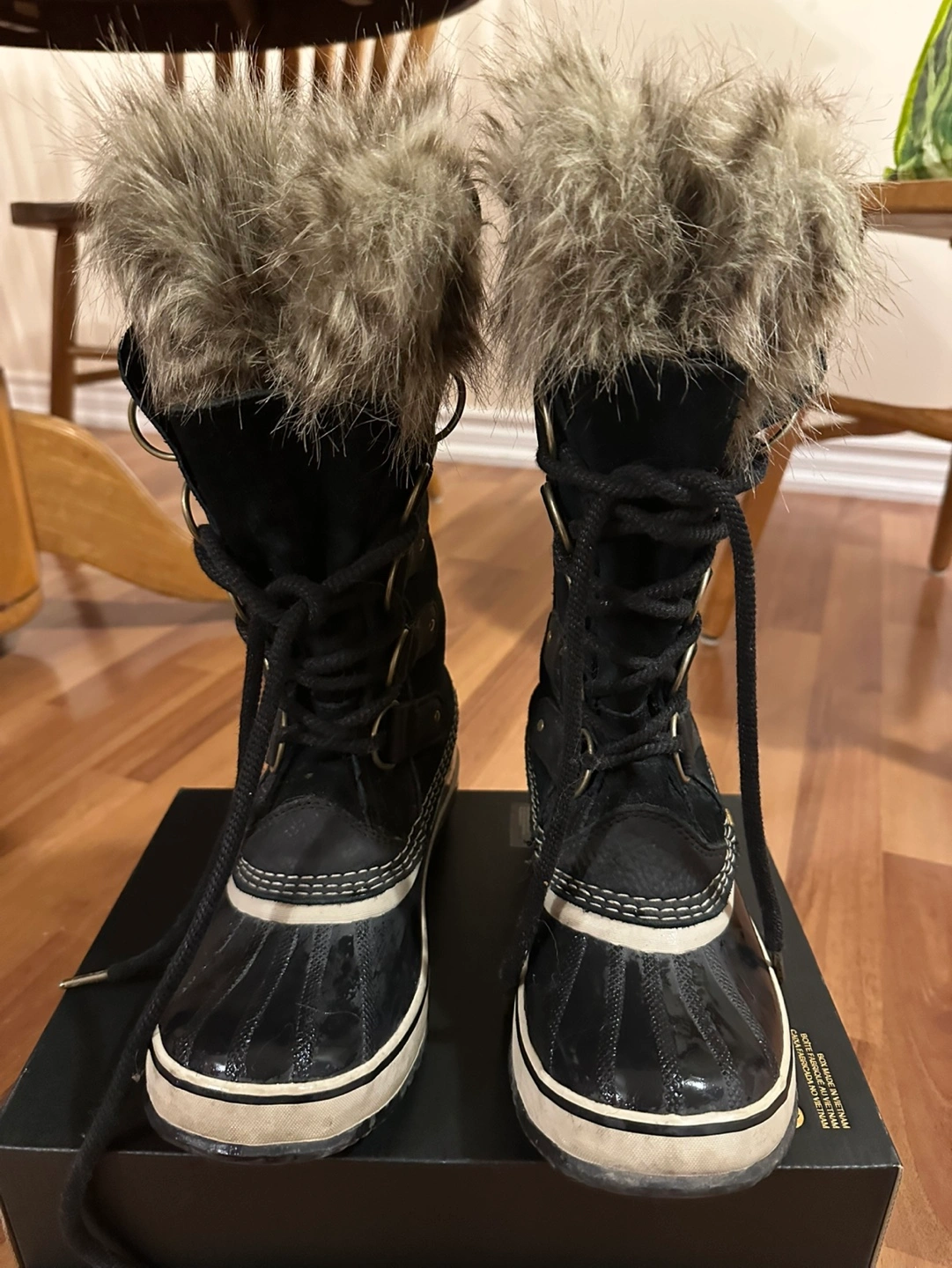 Black suede winter boots. Faux fur trim. Lace-up style. Good condition. Size Women's 8.