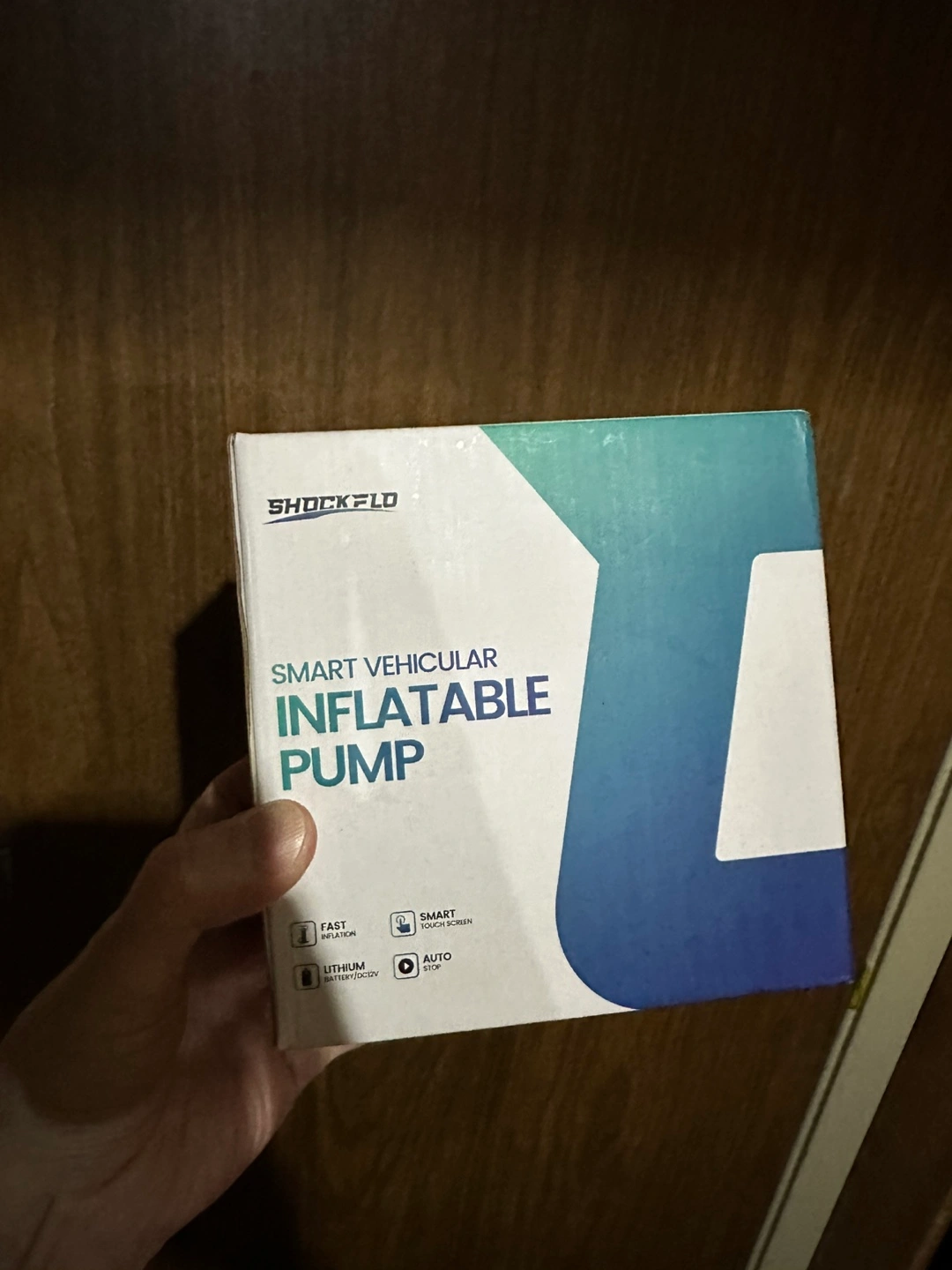 Portable air pump. Lithium battery powered. Features fast inflation, smart pressure, and auto shut-off functions. New, in box.