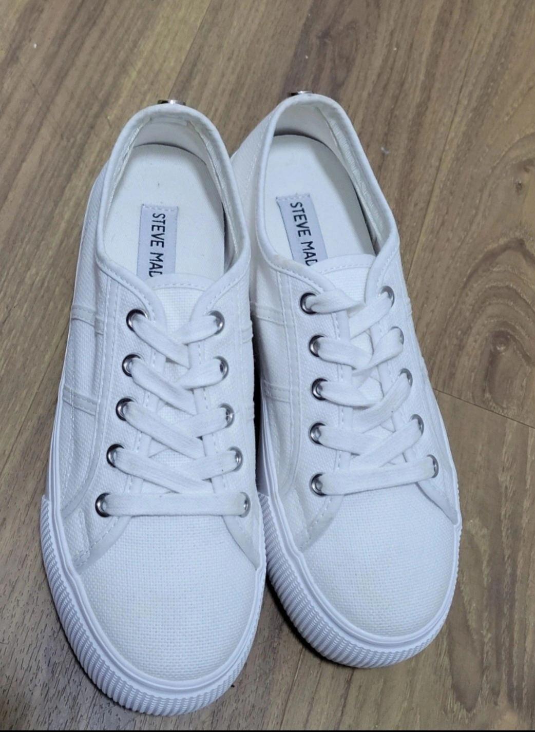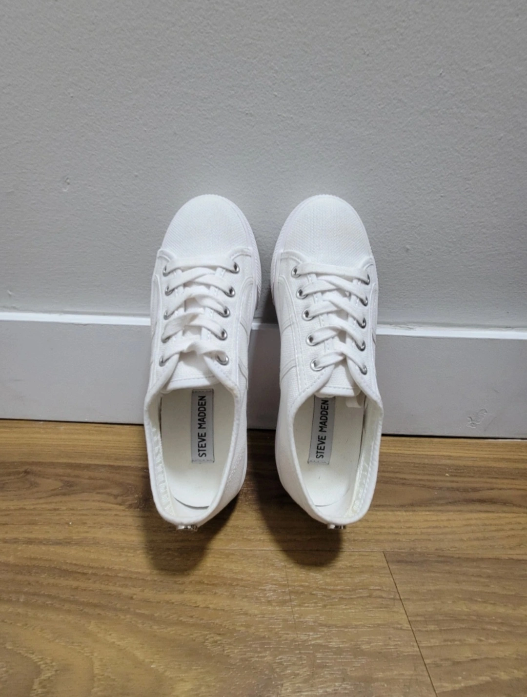 Women's Steve Madden platform sneakers. White canvas upper, fabric lining and sock. Fabric coated outsole. Made in China. Size 6M.