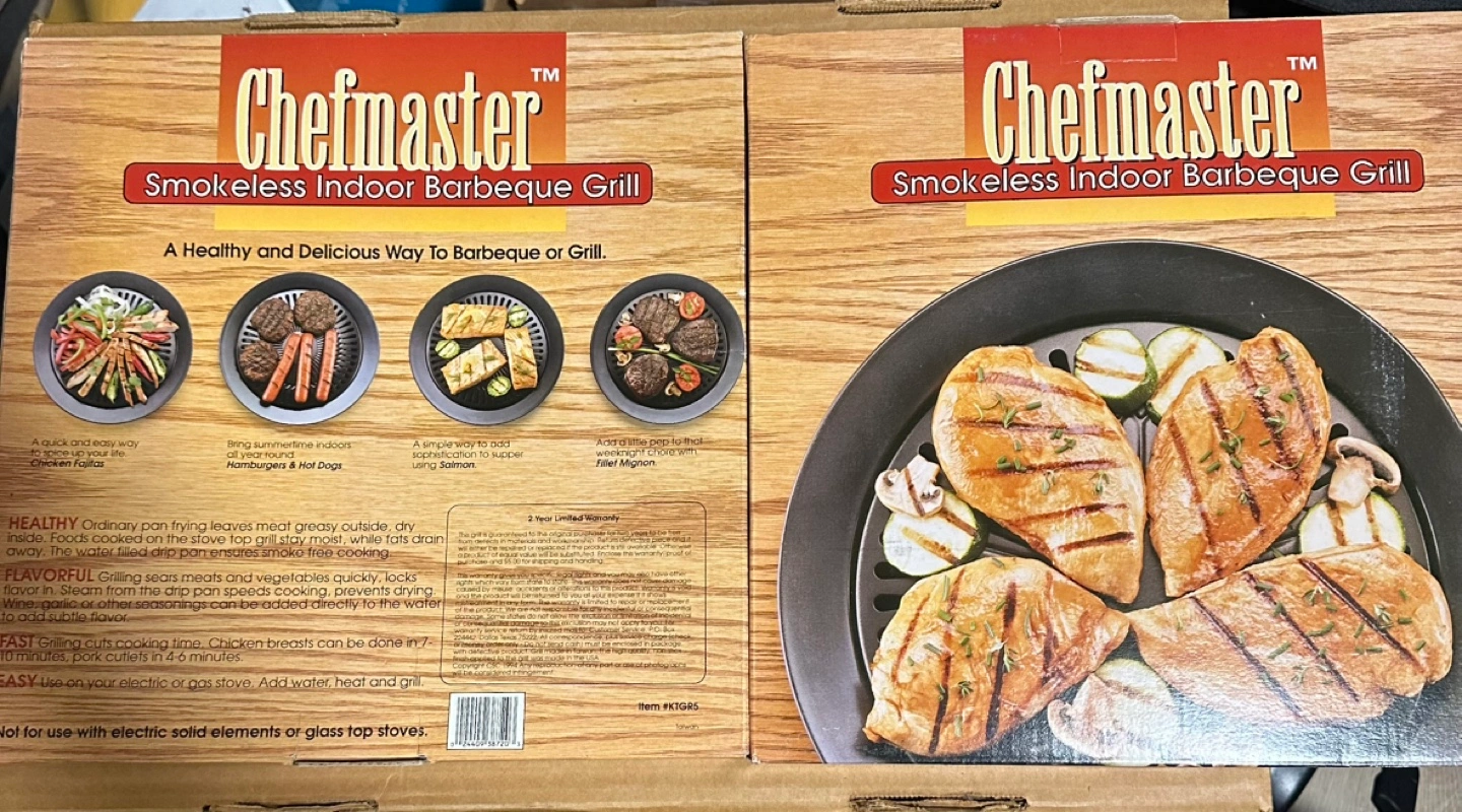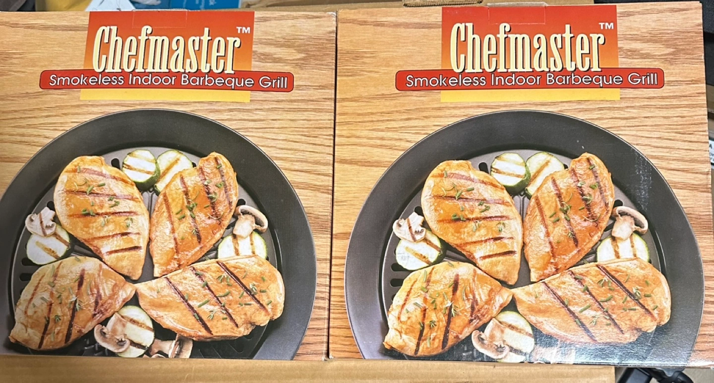 99Two brand new Chefmaster smokeless indoor barbeque grills. Healthy and delicious way to barbeque or grill. Use on electric, solid element, or glass top stove. Includes grilling plates.