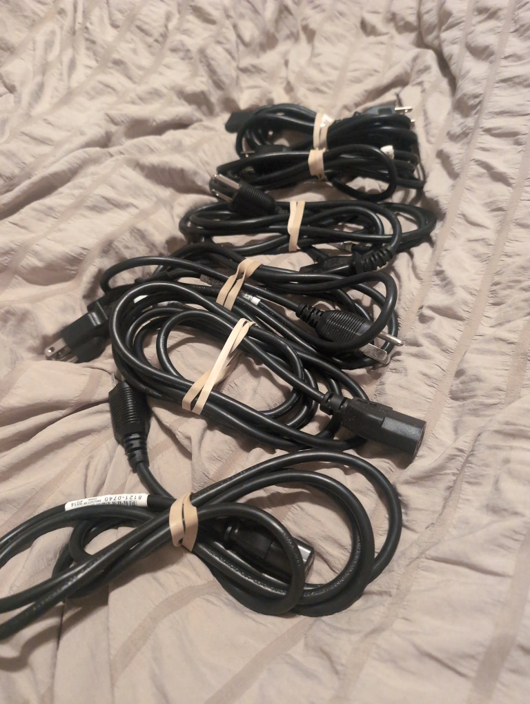 Several AC power cords, various lengths. Black cords, different plugs. Great for computers, electronics, etc. $4 each or 6 for $15