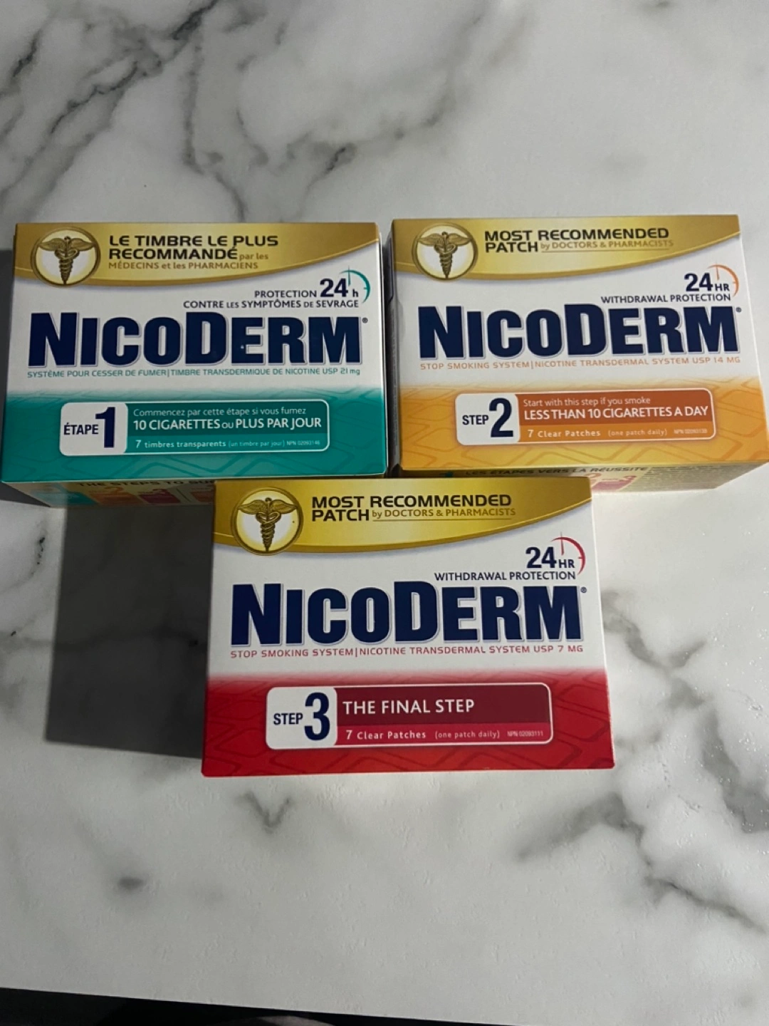 Three boxes of Nicoderm stop smoking patches. Complete 3-step system. Seven patches per box.