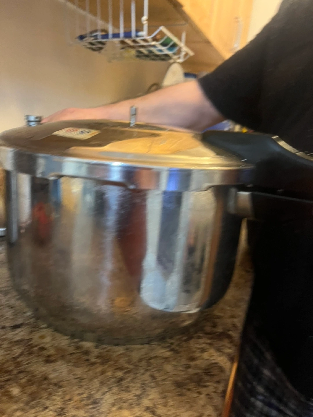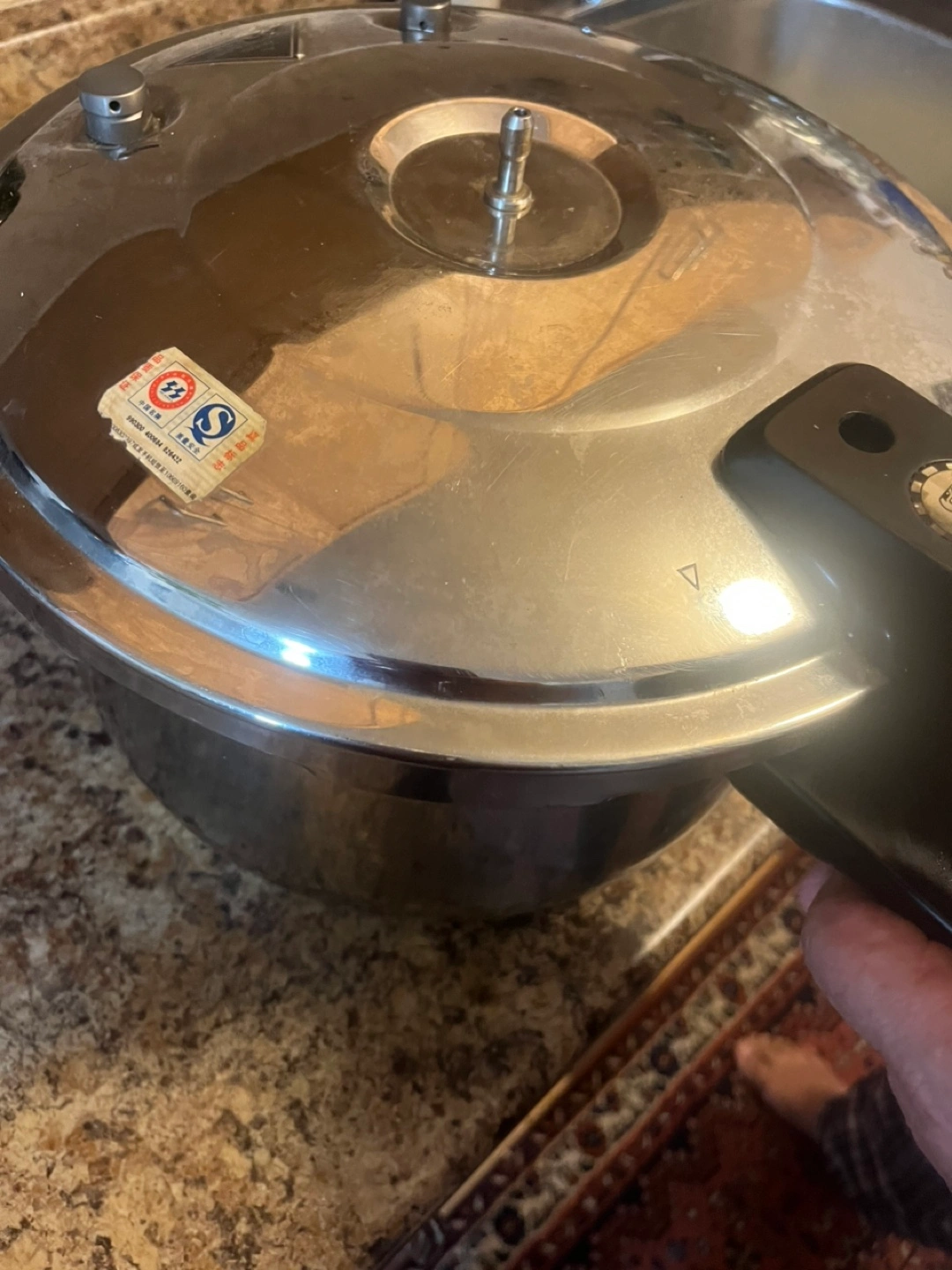 Large capacity pressure cooker. Stainless steel construction. Used condition. Shows signs of wear.