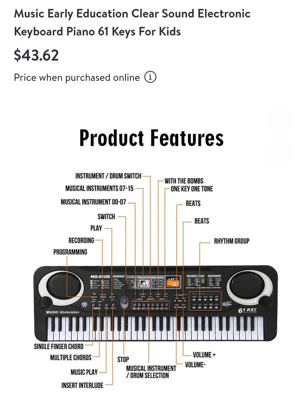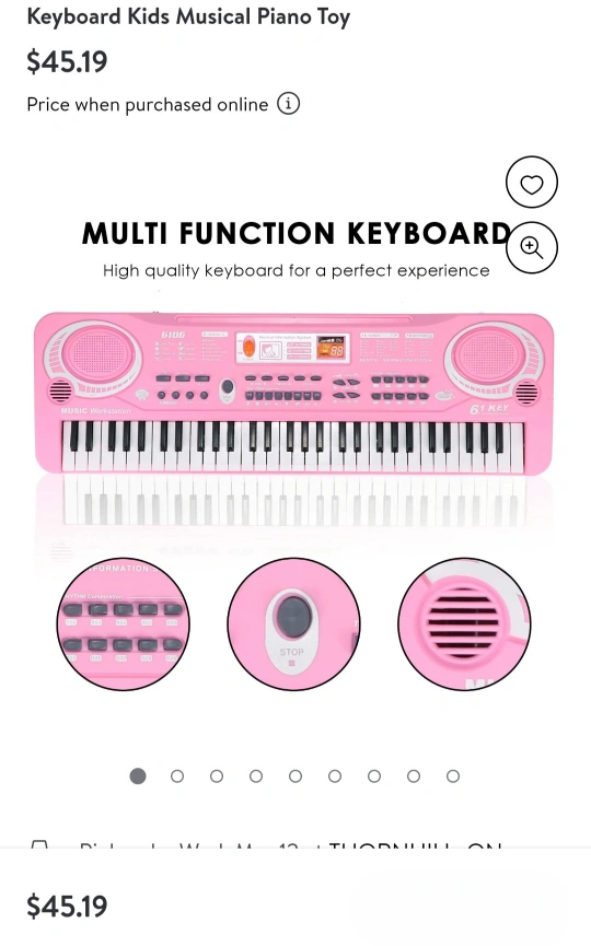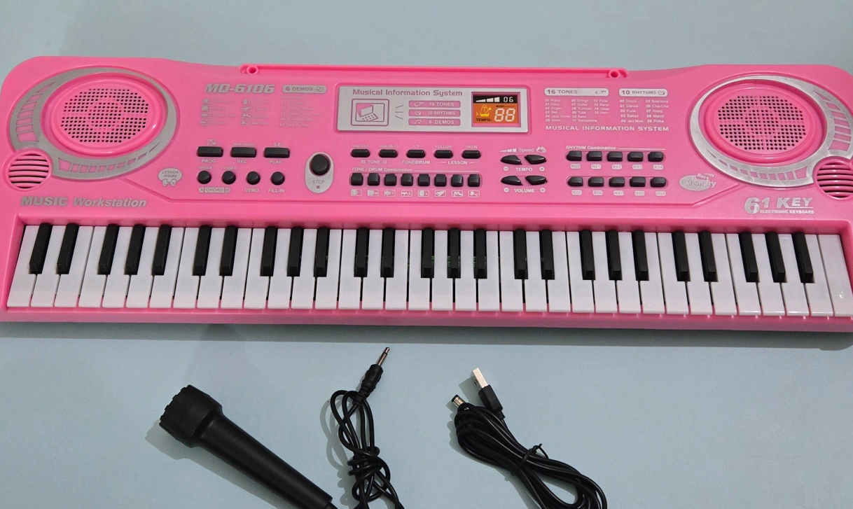 15261-key electronic keyboard piano. Pink. Includes microphone. Multiple sounds and rhythms. Great for kids learning music. Fun and educational. *** Every button has a function.