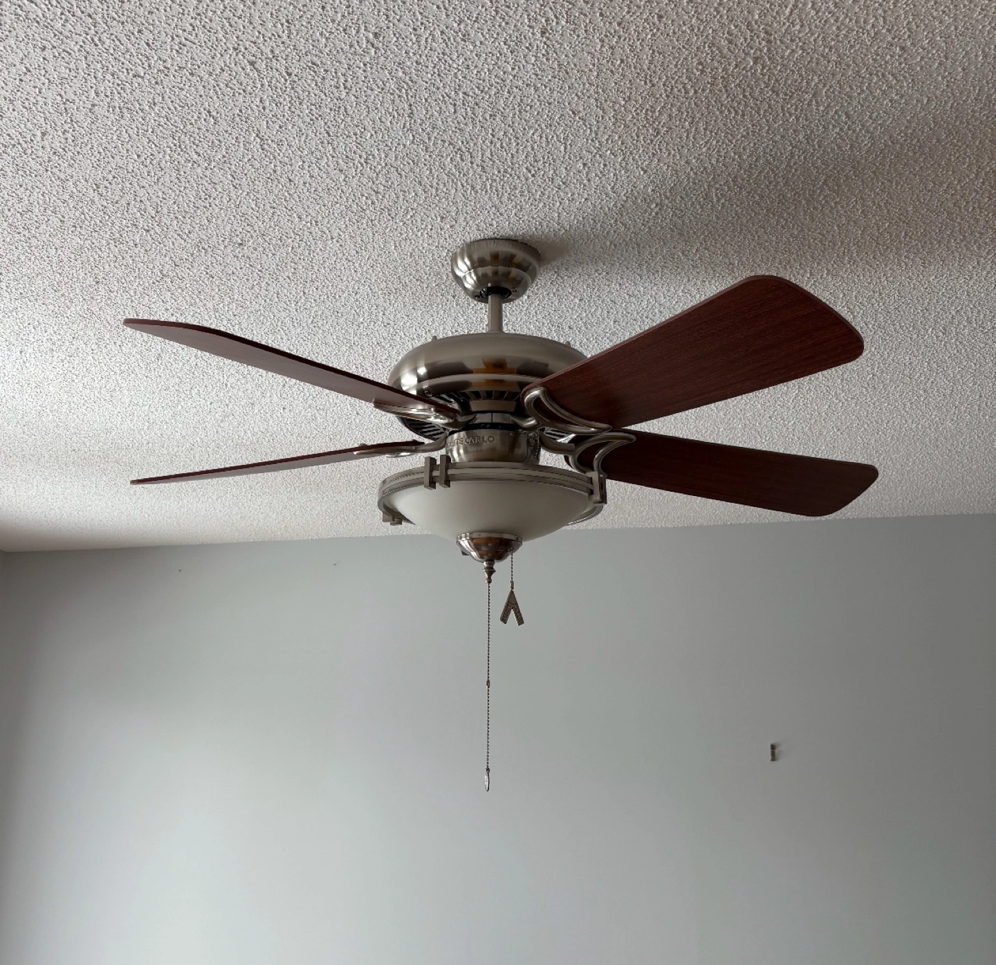 Five-blade ceiling fan. Brushed nickel finish. Dark wood blades. Includes a light kit with frosted glass shade. Pull chain.