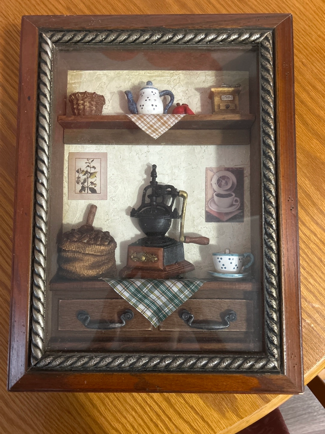 Intricate shadow box featuring miniature coffee-themed figurines. Wooden frame with glass front. Includes coffee grinder, teapot, coffee cups, and more.