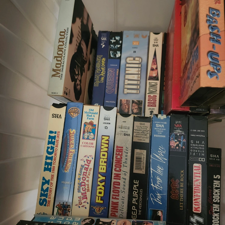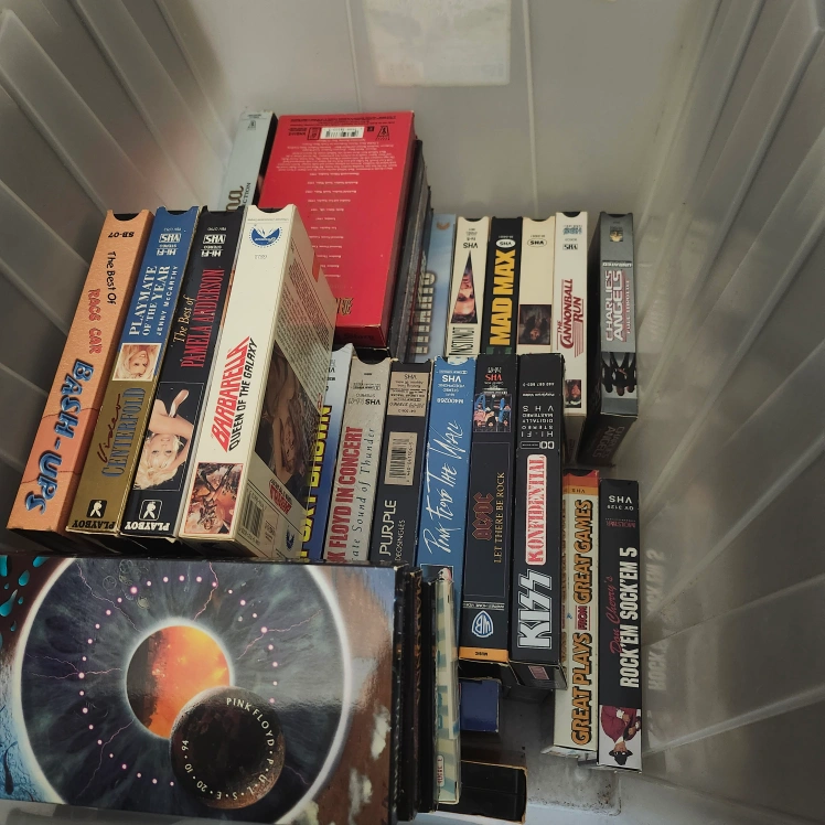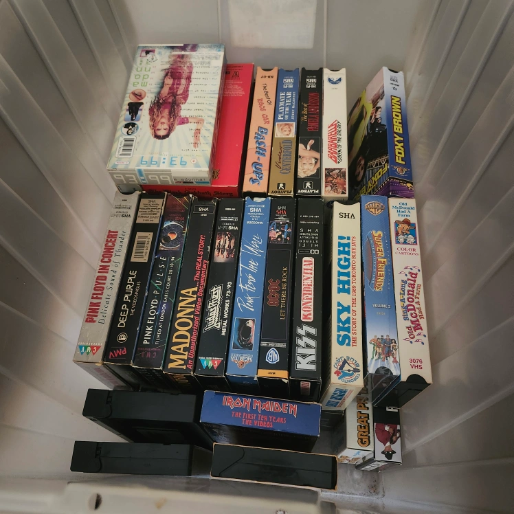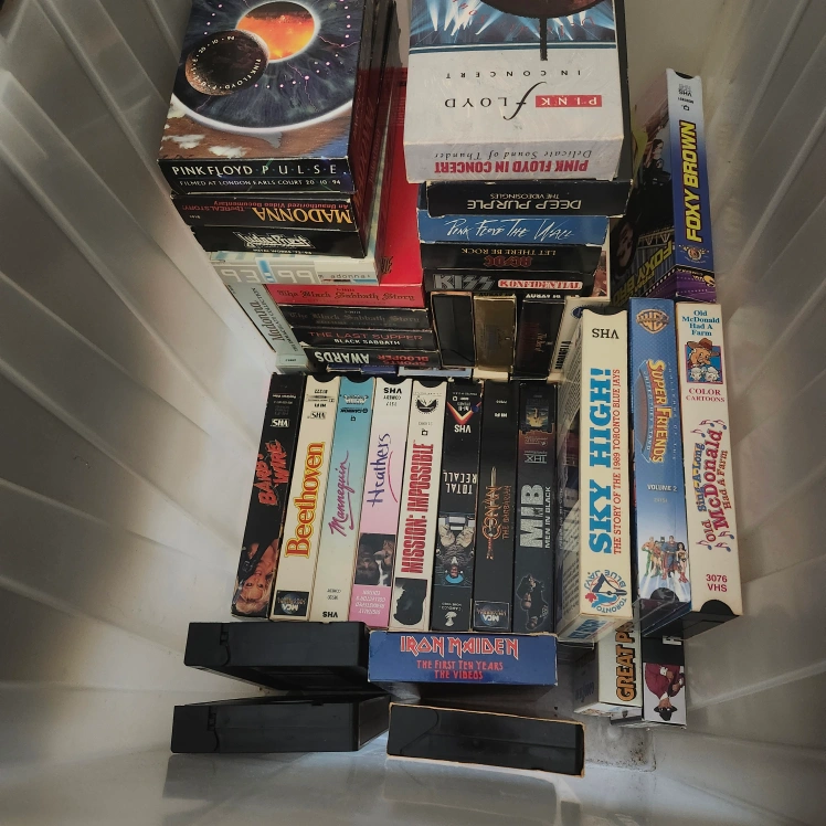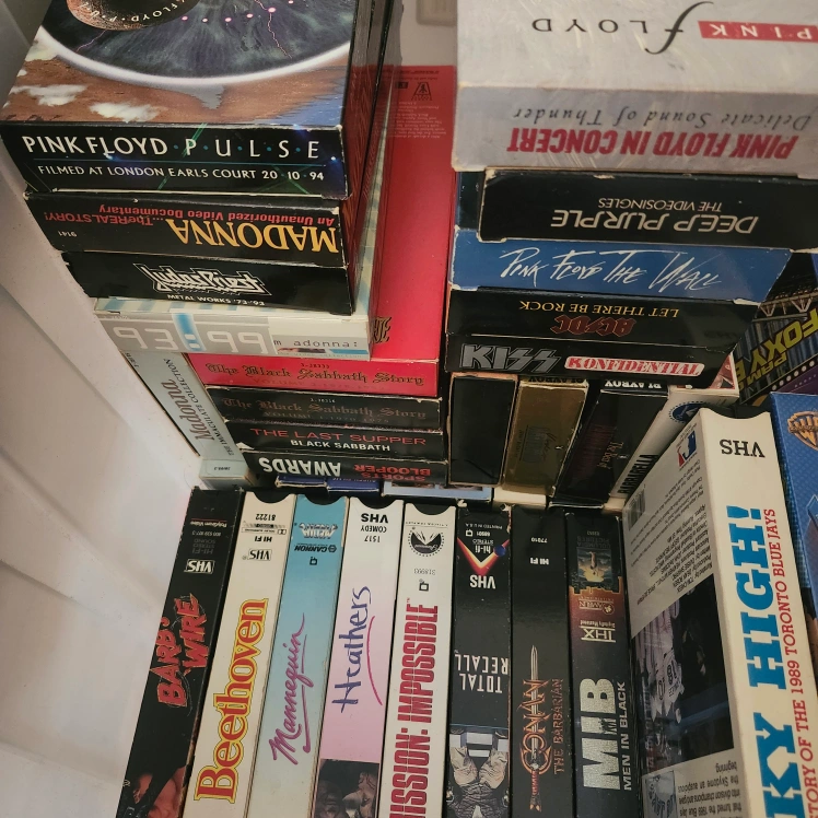 40+ of VHS tapes. Includes music videos from various artists like Pink Floyd, Madonna, KISS, and more. Also features movies and other video content. Great for collectors or nostalgic viewers. pick up
