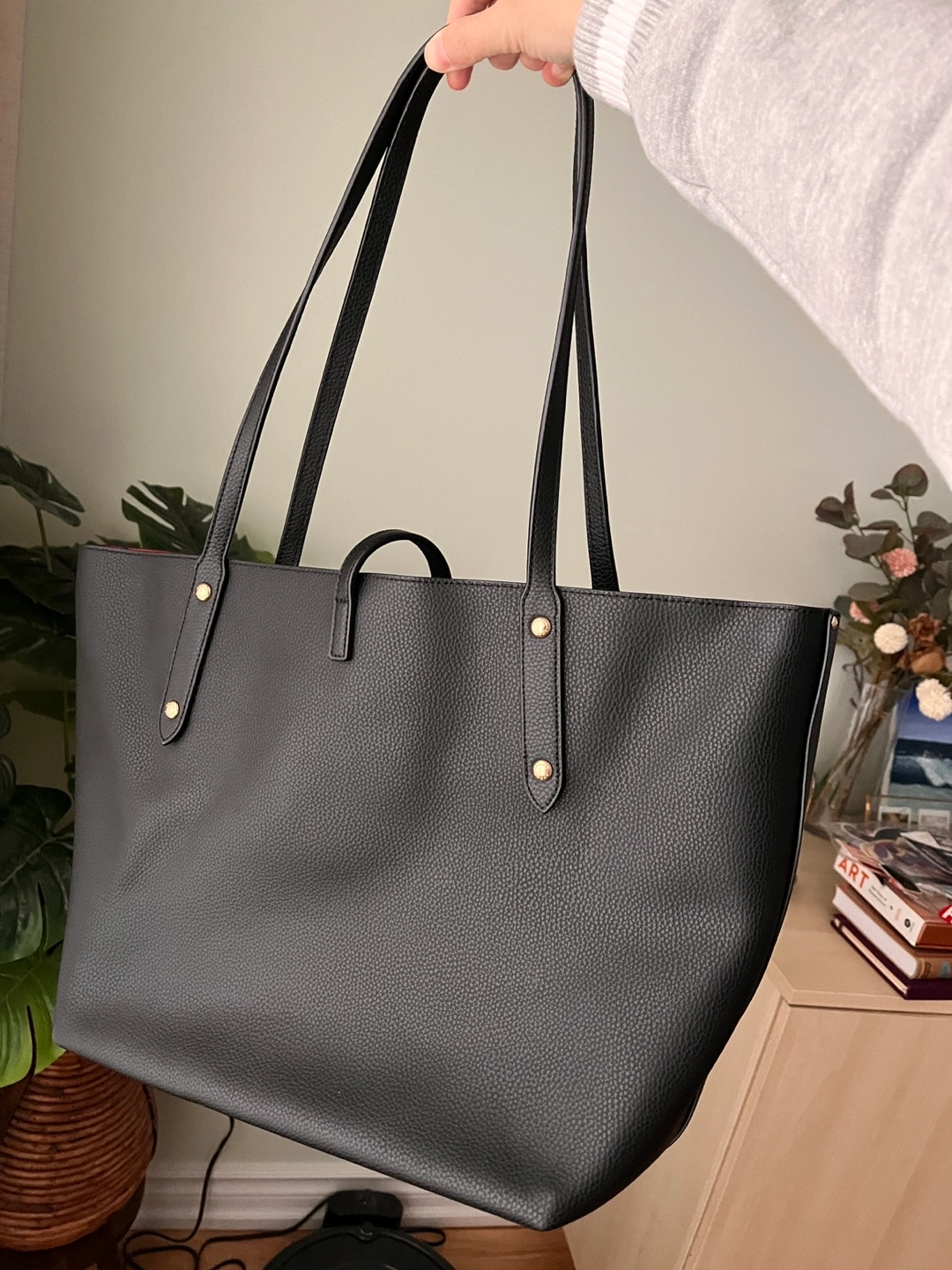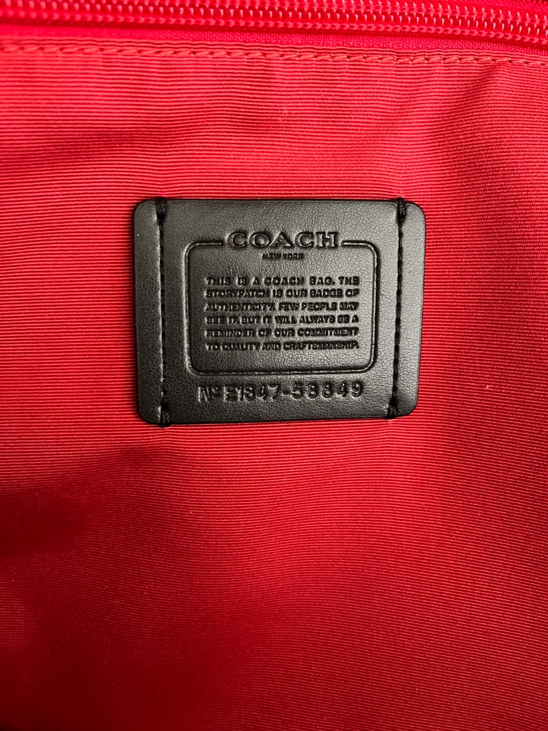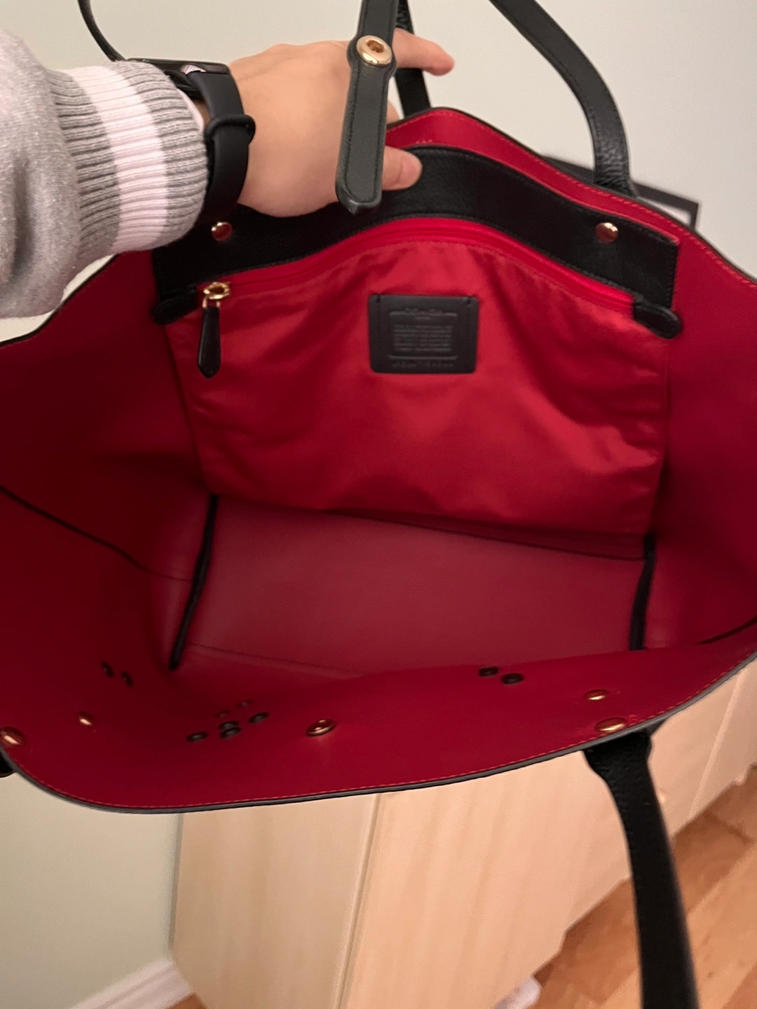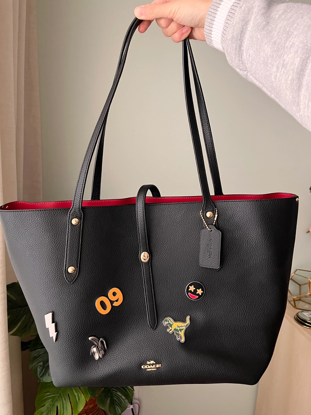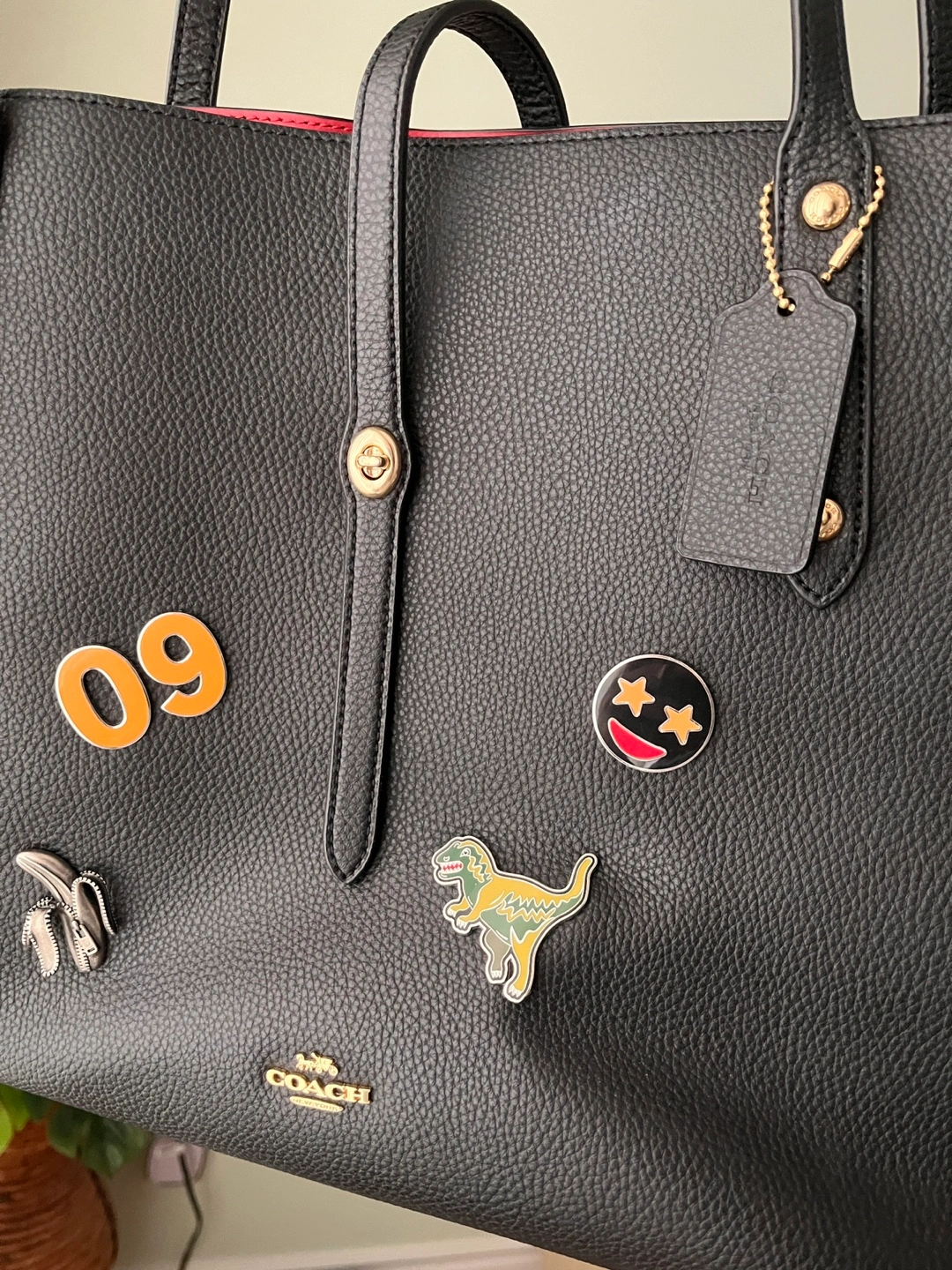 Black pebbled leather tote bag. Red interior. Two top handles. Gold-toned hardware. Features several customized pins (not removable). Used once only.