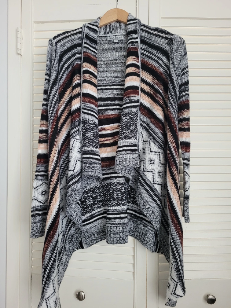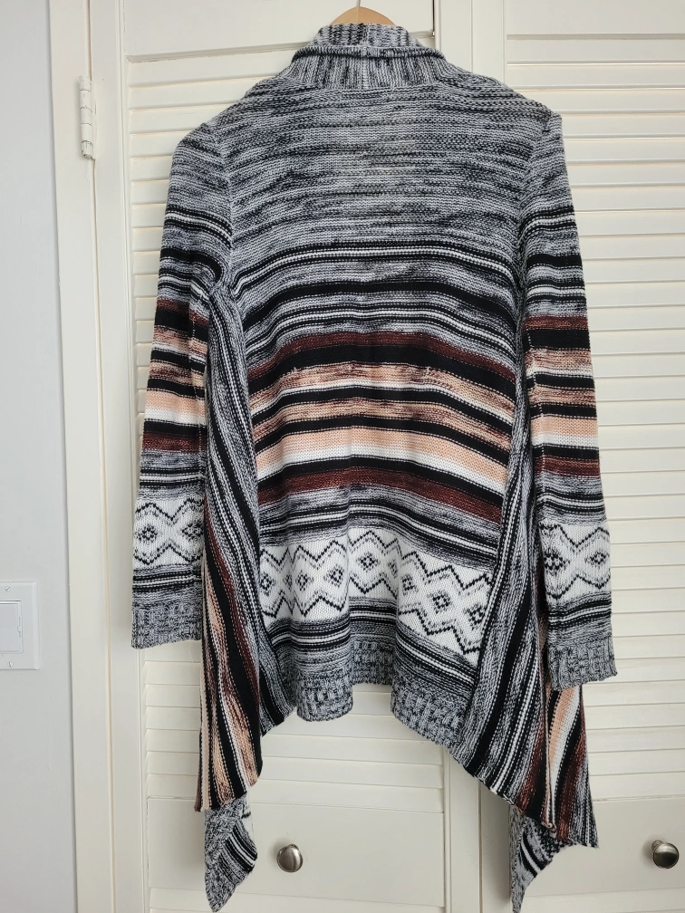 Women's open-front cardigan. Features a waterfall hem and long sleeves. Multicoloured stripes and patterns. Knit material. Cozy and stylish.