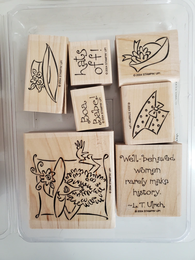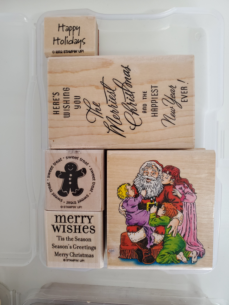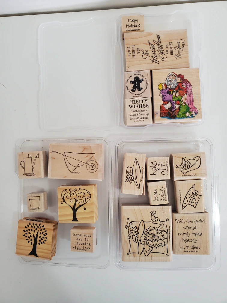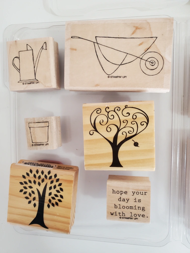 Collection of wood-mounted rubber stamps. Includes various gardening and holiday designs. Perfect for scrapbooking and card making.