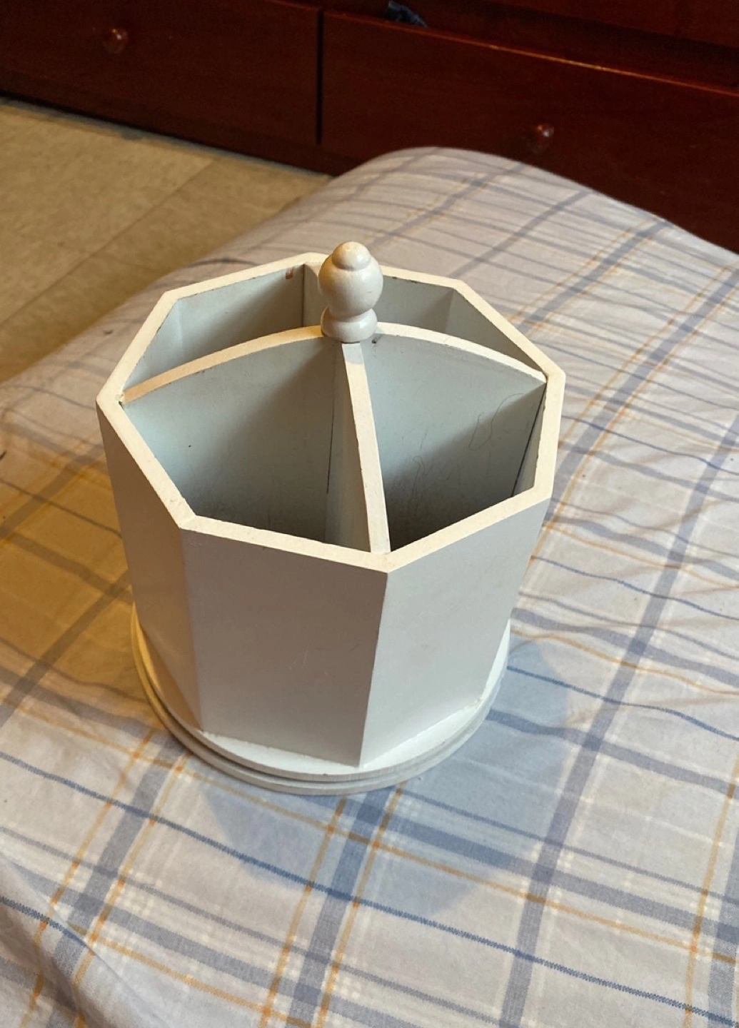 Rotating organizer. Eight sides. Four compartments. Small knob on top. Perfect for makeup brushes, pens, or other small items.