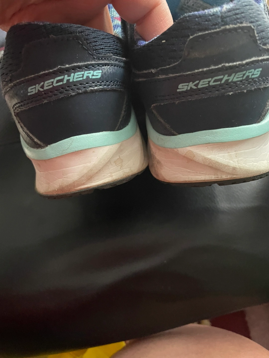 Pre-owned Skechers running shoes. Navy blue with teal accents. Some wear and tear, but still wearable. Great for everyday use or light exercise. Size 9