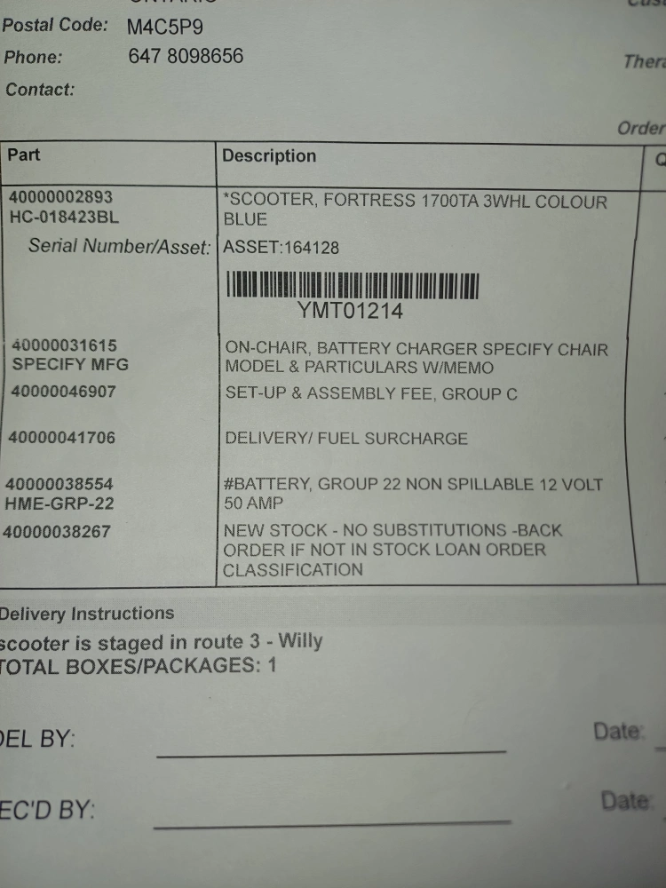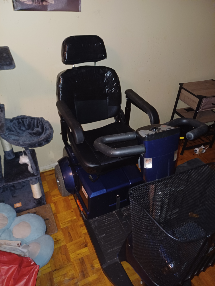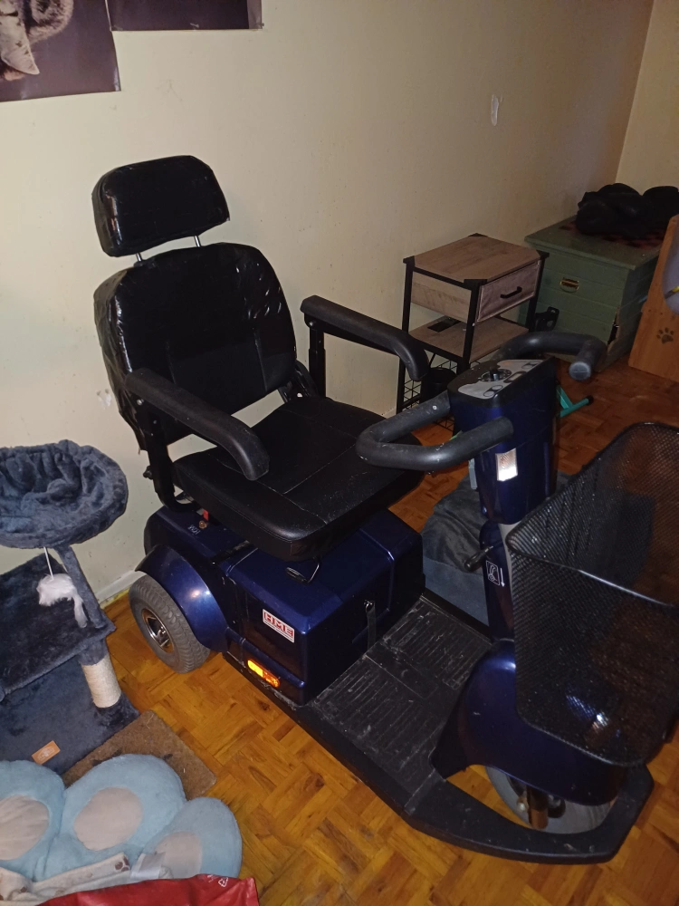 Three-wheeled mobility scooter. Blue body. Black seat currently covered in duct tape to cover cat scratches. I can't afford to do cosmetic work on it. Front basket. Used condition but works great. Brand new batteries. Proof is there showing how much it costs and also the fact I paid for new batteries yesterday which costed a total of $1280. This is a great price I'm selling for as it is a lot of money. Take as is. I'm not going any lower. This was almost $4,000 and I just paid $1280 to make sure it had brand new fresh batteries. I have to keep lowering the price why, I don't know. Especially when other people are selling theirs for $1000 or more. And I'm sure they didn't just pay a ton to make sure whoever buys it get brand new batteries to make sure it has a long life. If you look at my reviews, I have nothing but good reviews. I don't scam and I'm a very nice person but people keep trying to scam me. Don't ask if you can only give me $100 because I've already lowered it so low I won't even be making any money back for the batteries I just bought. I need this gone ASAP as I need space in my home for someone to move in.