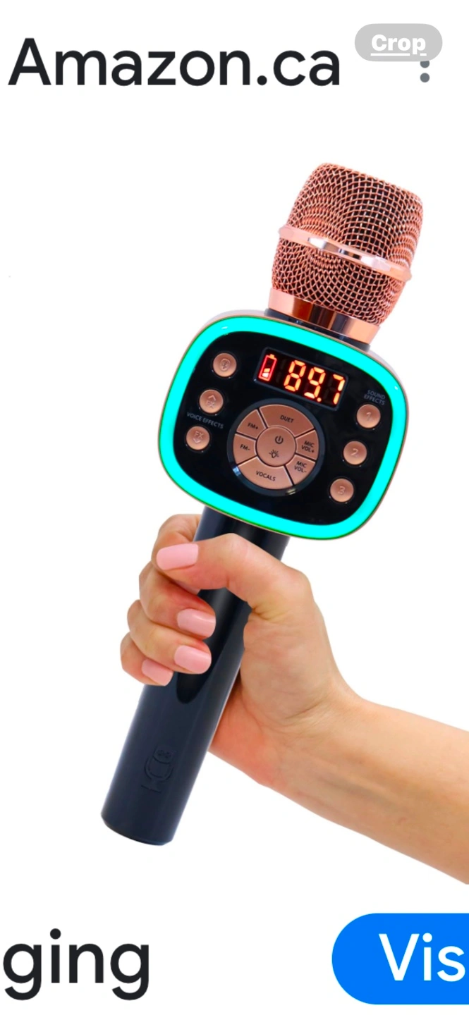 Portable karaoke microphone. Features Bluetooth connectivity, multiple sound effects, and a digital display. Rose gold and black colour scheme. Great for singing along to your favourite tunes.