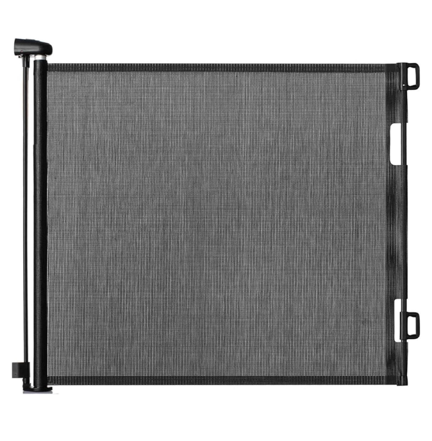 Black retractable safety gate. Wall mounted. Adjustable width. For child safety.