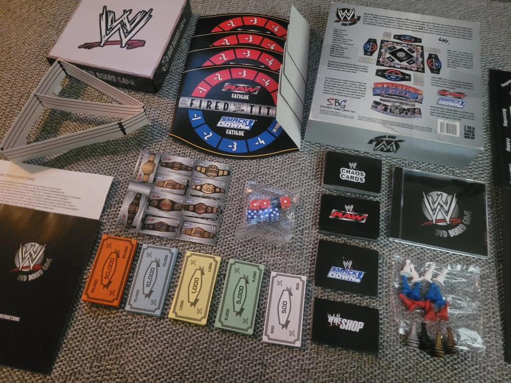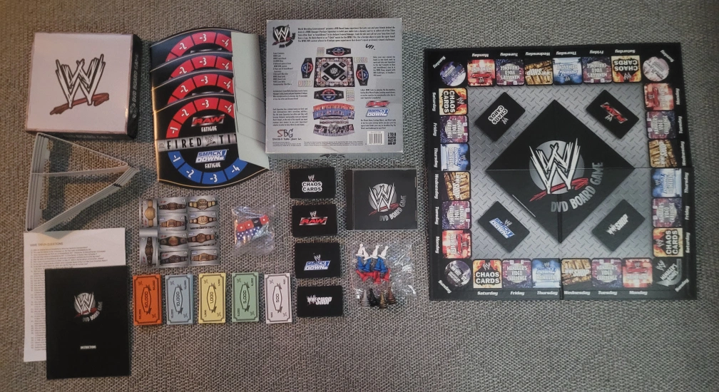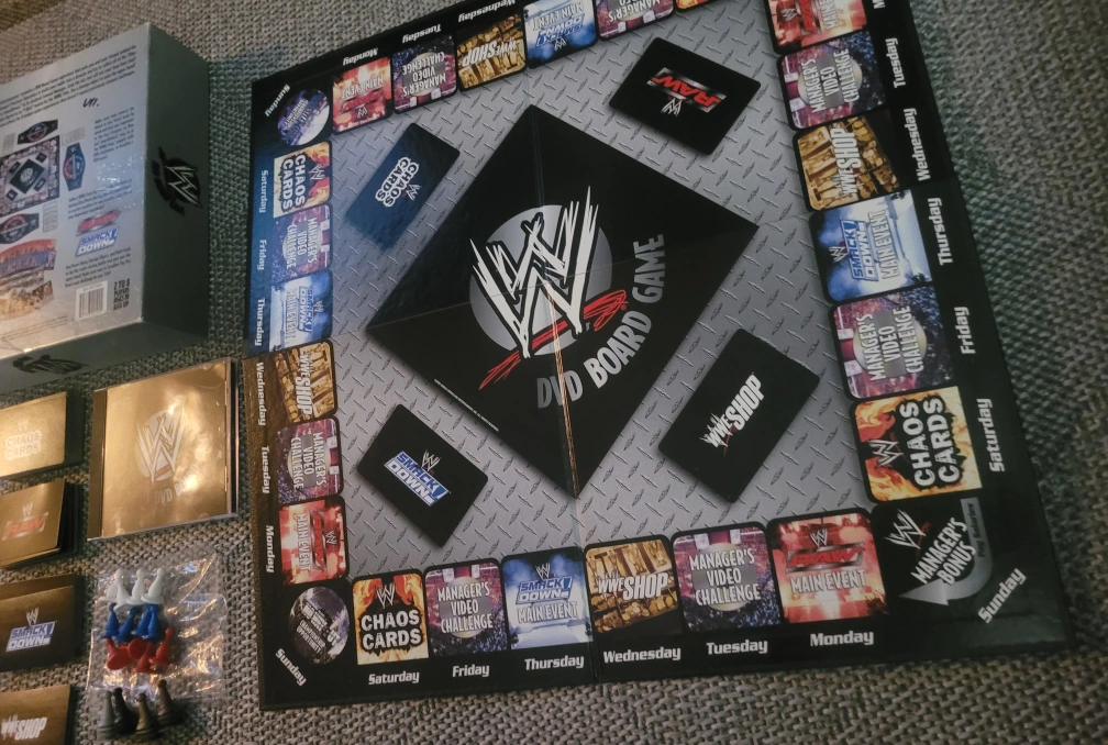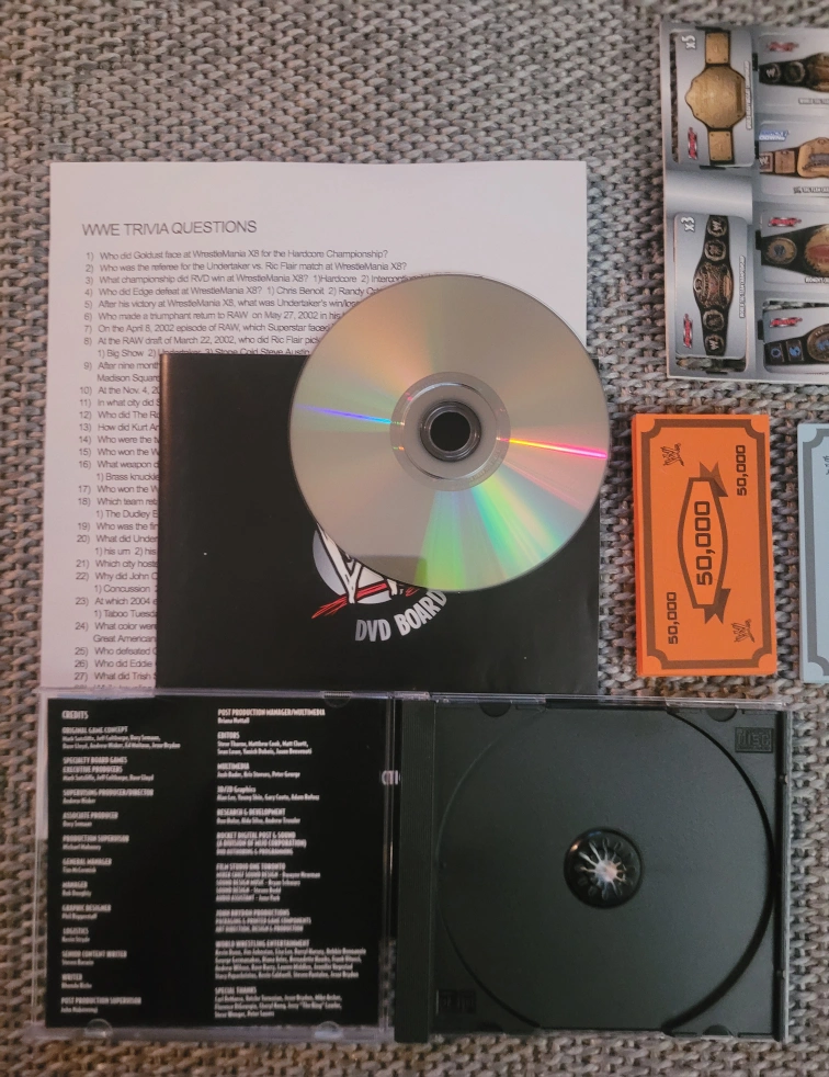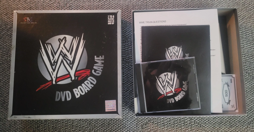 Complete WWE DVD Board Game. Includes game board, cards, pieces, and DVD. Great condition. Was opened and never used. Fun for wrestling fans.