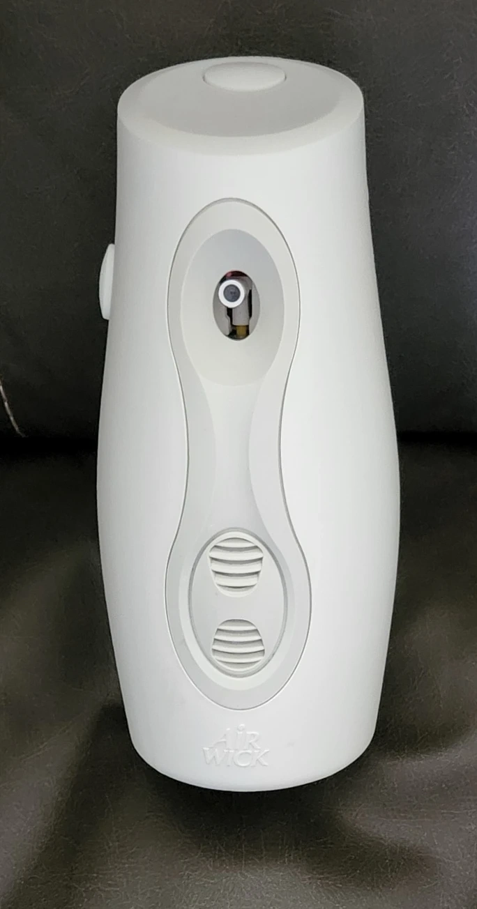 Air Wick automatic air freshener. Includes a can of air freshener spay used 1 or 2 times only. Needs batteries to operate but other than that it is ready to use. Programable wall mount air freshener. Uses 2 AA batteries - not included. View my other listing and we can look at package deals - get a bargain. see link below for manufacturers details on product.
