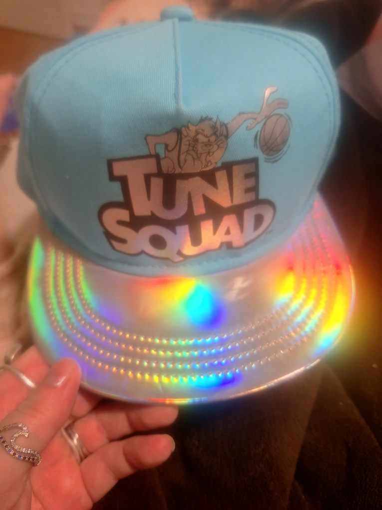 Light blue adjustable baseball cap. Features iridescent silver-coloured visor. Tune Squad logo on front. Space Jam branding on tag.
