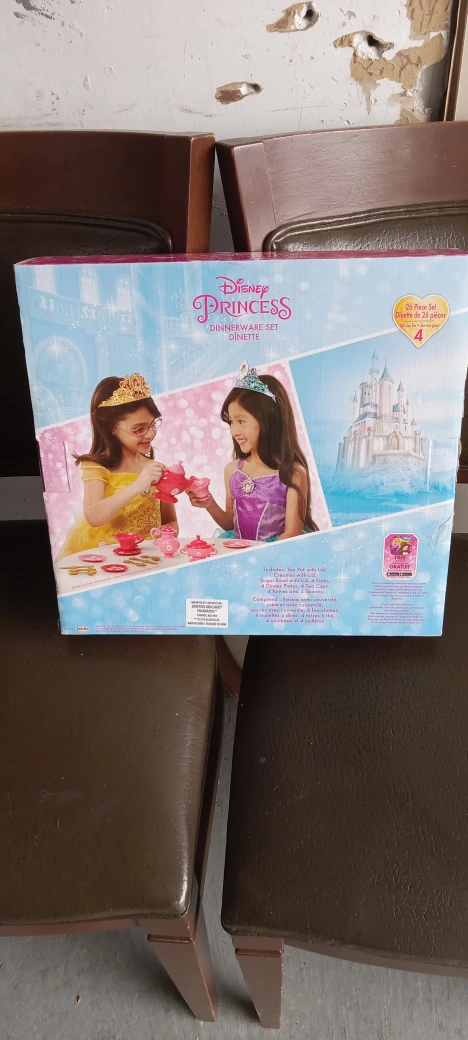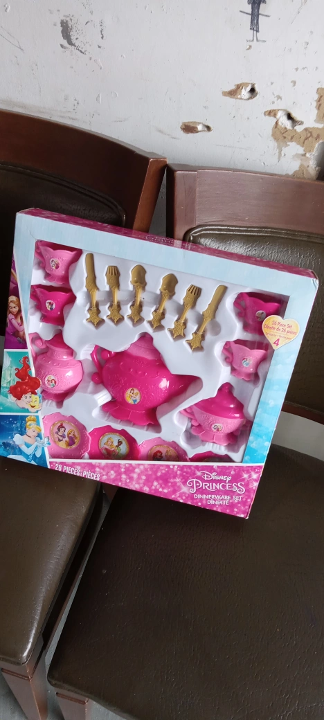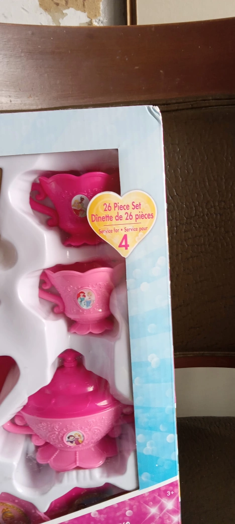 564New in box. Pink plastic tea set. Includes teapot, cups, saucers, spoons, and forks. Serves four. Great for pretend play.
