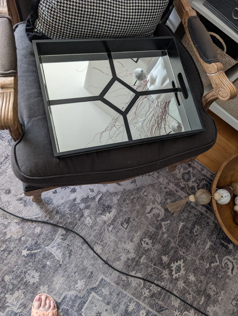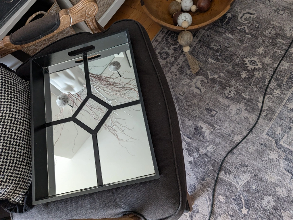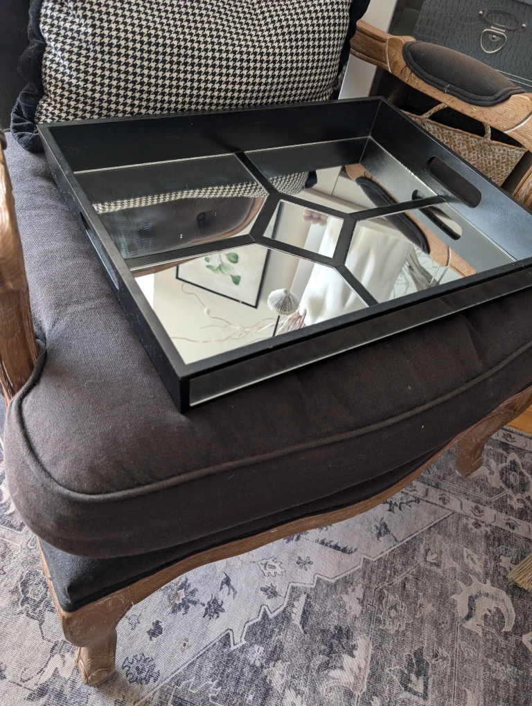 Rectangular tray. Black frame. Mirrored surface divided into geometric sections. Carry handle. Decorative piece. Great for serving or display.