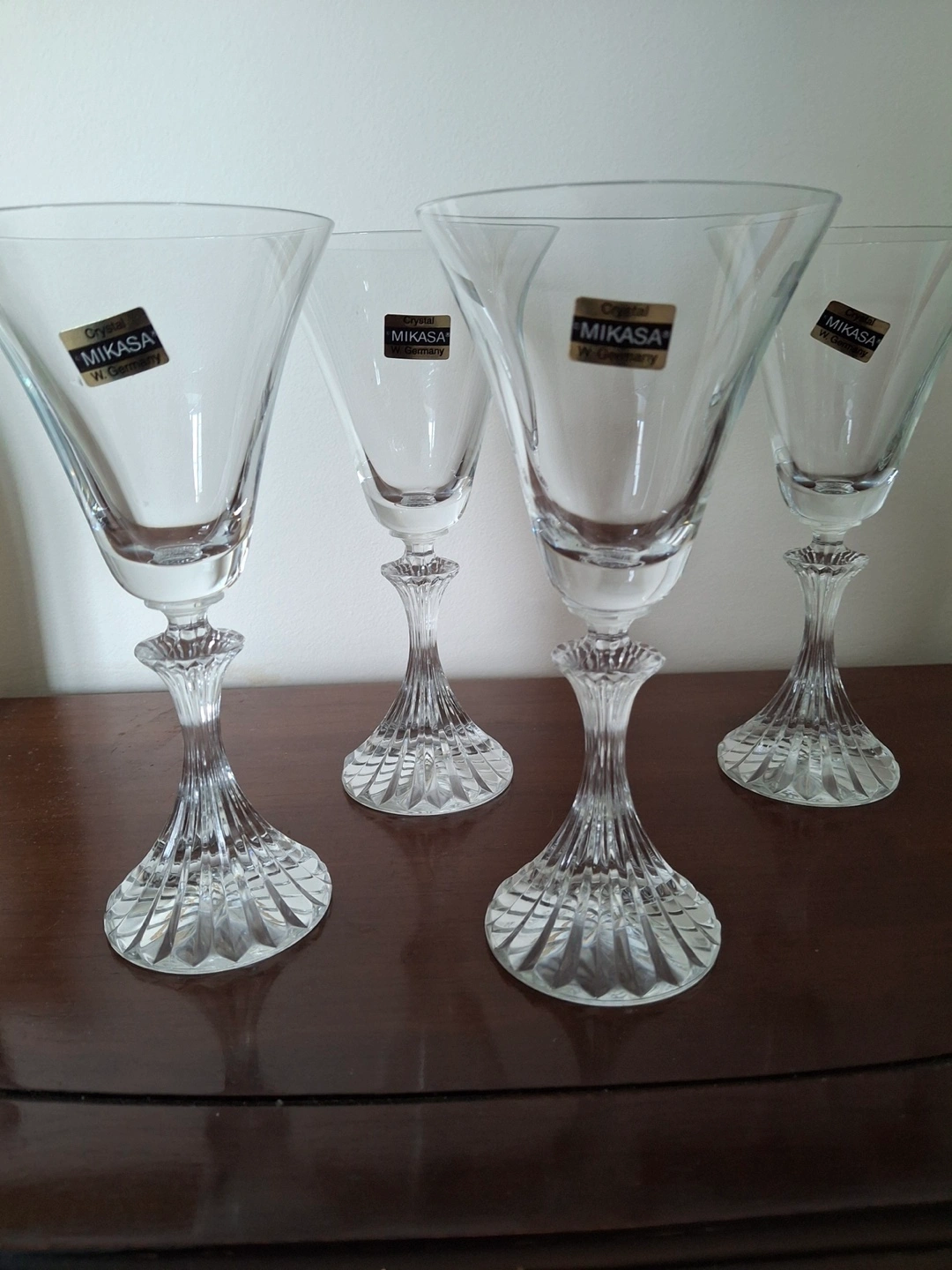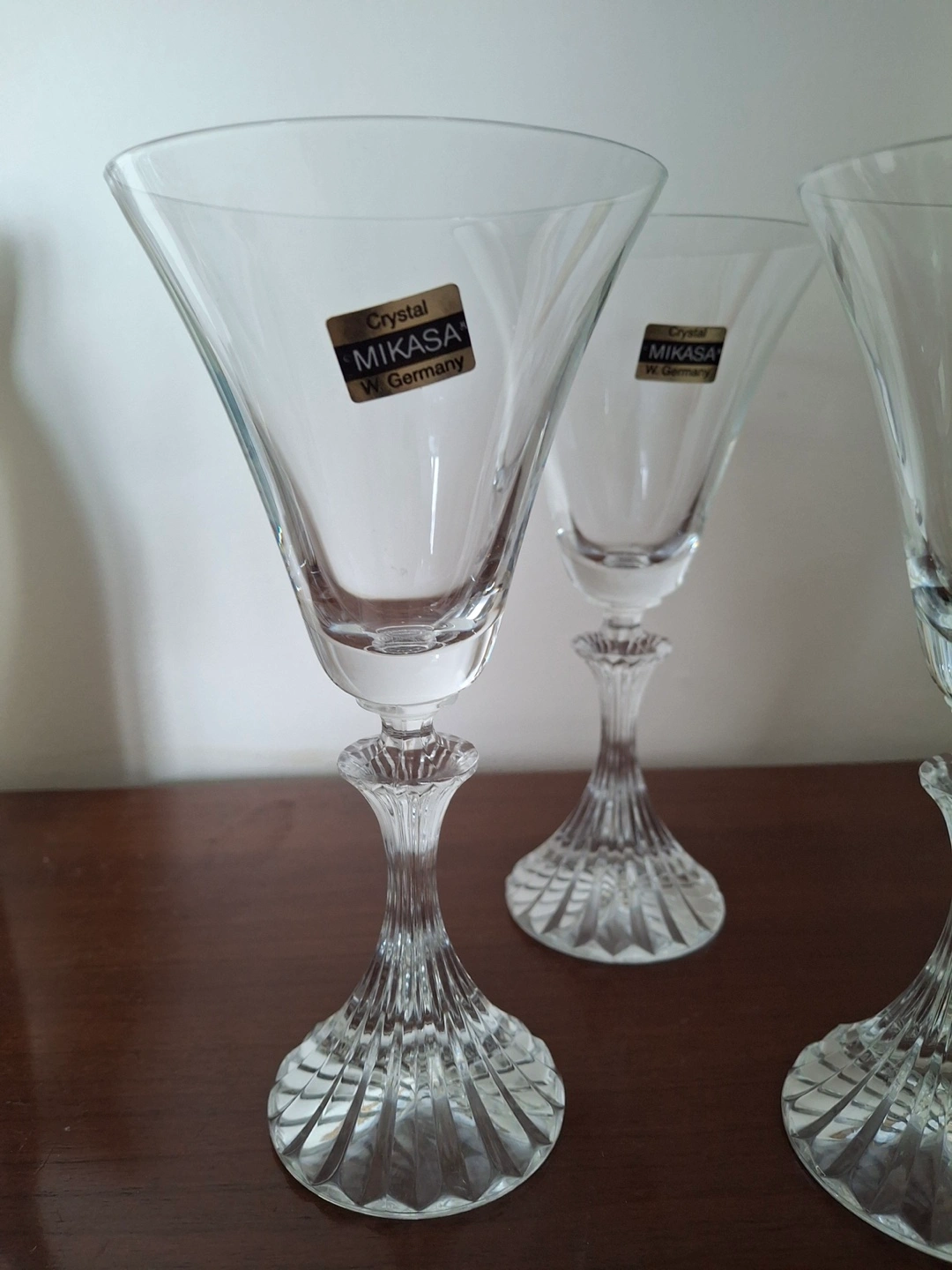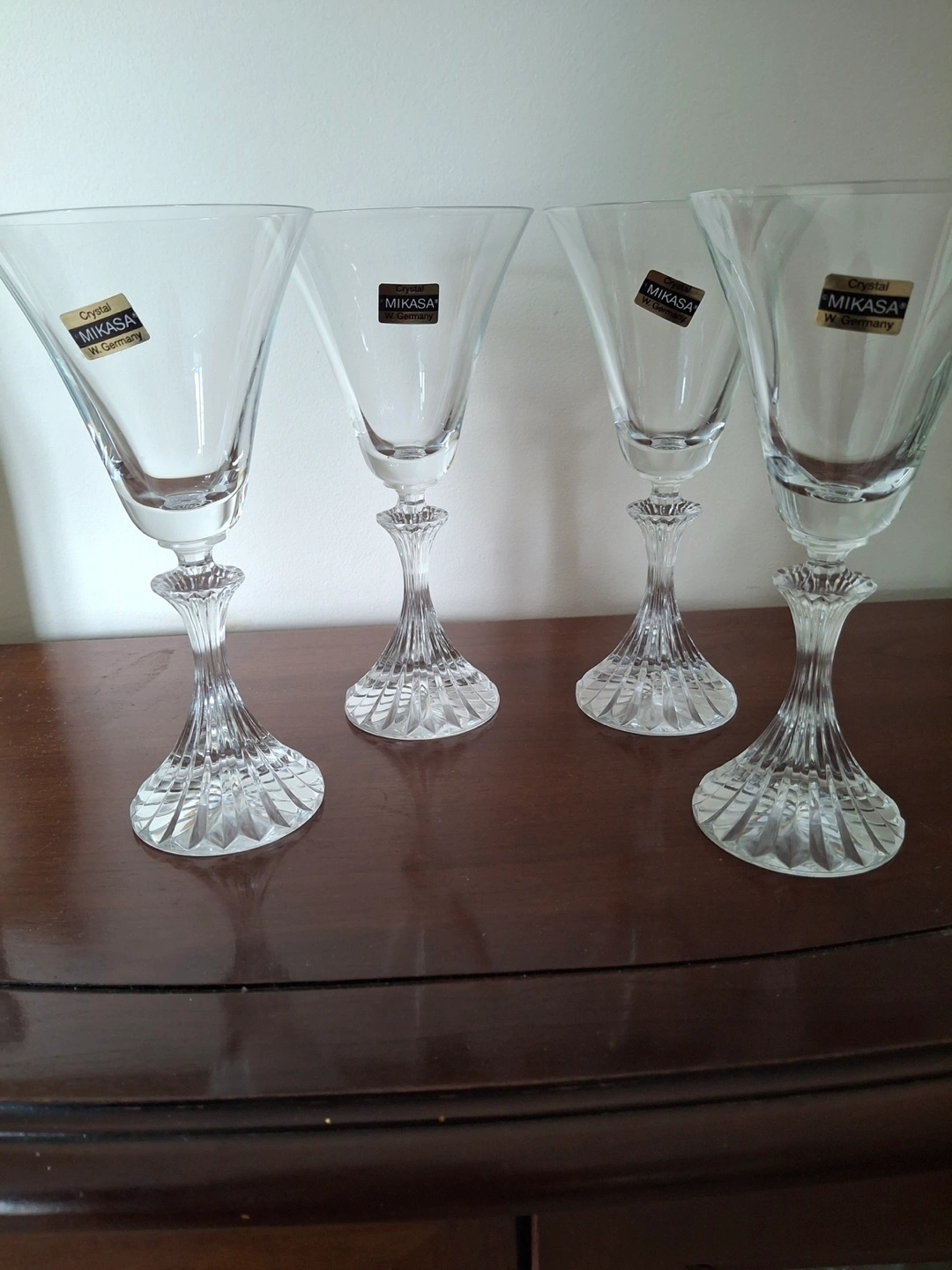 4 vintage wine glasses. Beautiful cut glass design, approx 7” tall. Mikasa “Stratton” - Made in West Germany, 1990. Still in original box with price tag (paid $40).