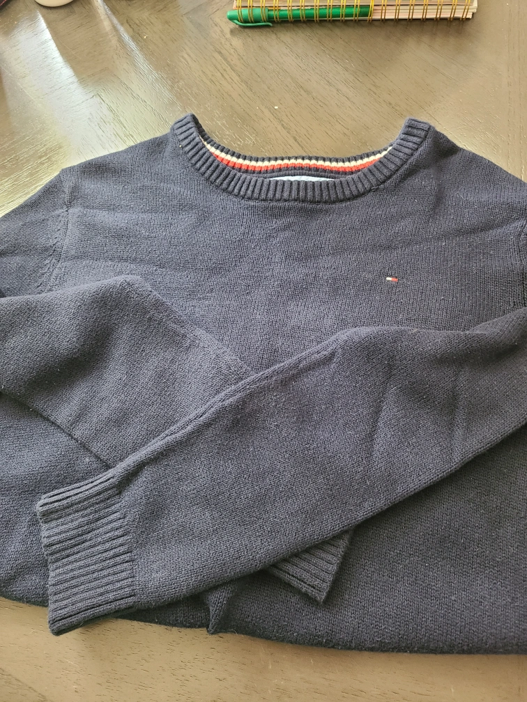 Dark navy blue cotton crewneck sweater. Features a thin coloured stripe at the neckline. Long sleeves, ribbed cuffs and hem. Good condition.its a kids size xl (16-18)