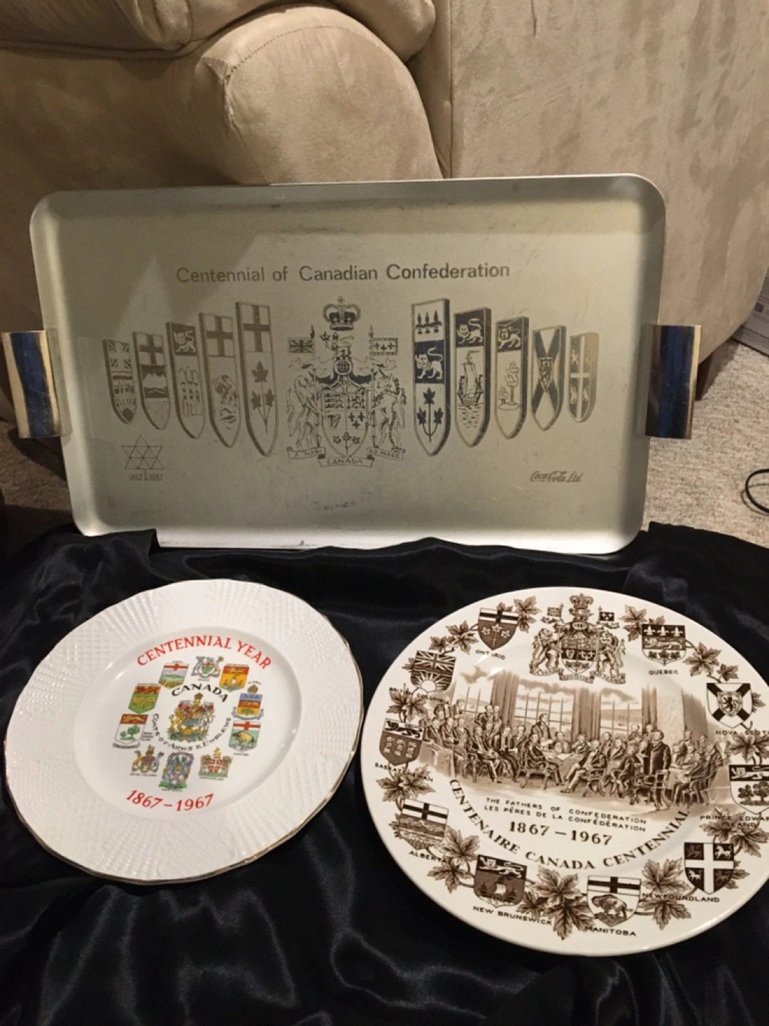 361Collectible Canadian Centennial memorabilia. Includes a Coca-Cola Ltd. tray and two commemorative plates. Features provincial coats of arms and imagery from 1867. Thanks and please see my other ads!