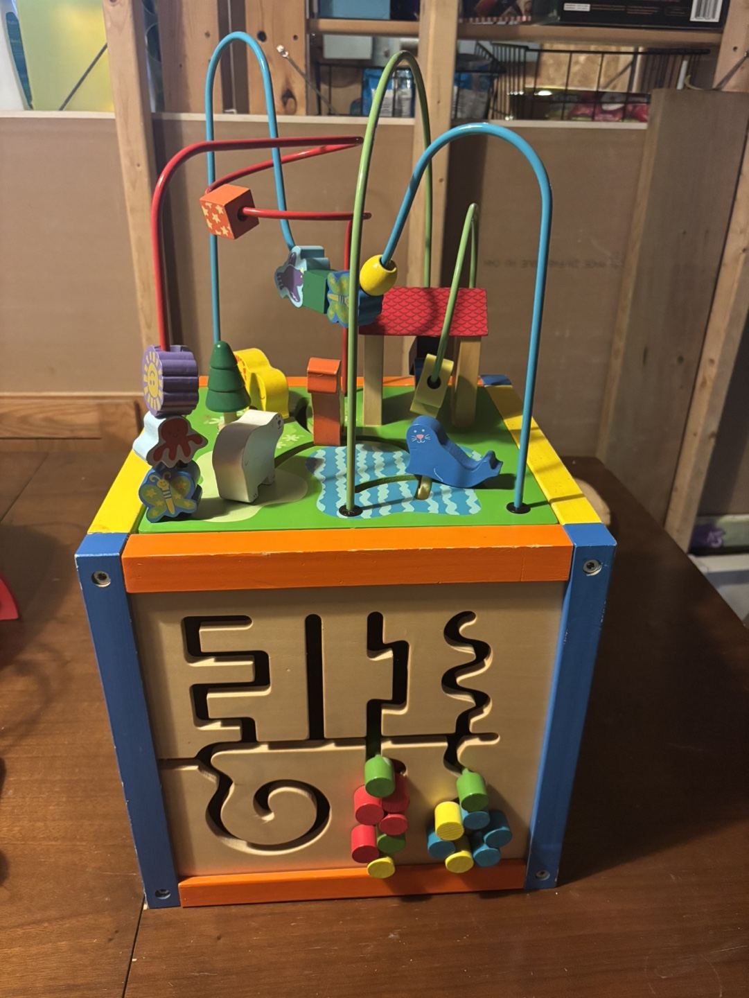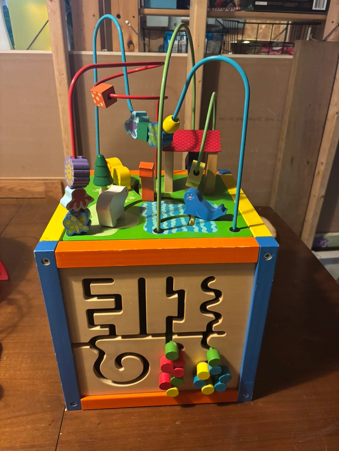 Multi-coloured wooden cube features a bead maze, shape sorter, and other activities. Great for toddlers. Lots of colourful pieces.