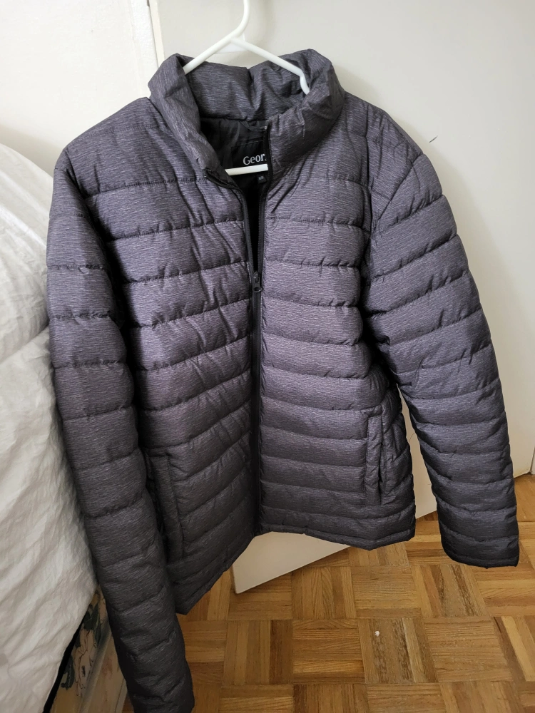 Grey puffer jacket. Size medium. Zipper closure. Good for colder weather. Horizontal quilted design. lightly used , excellent condtion