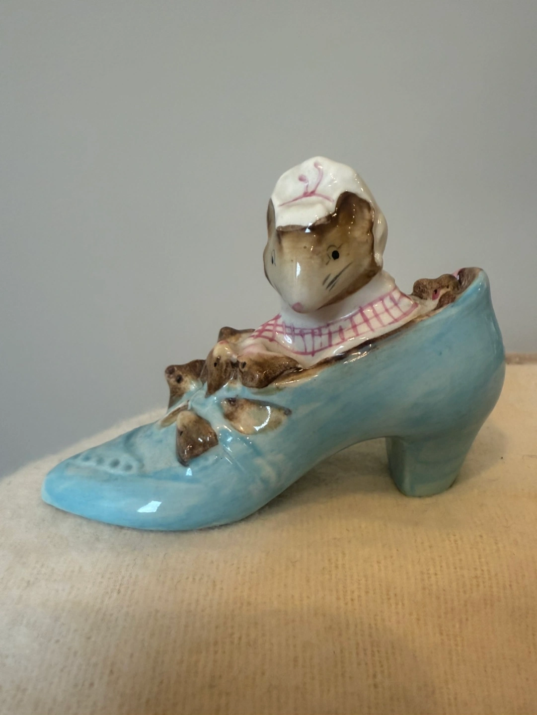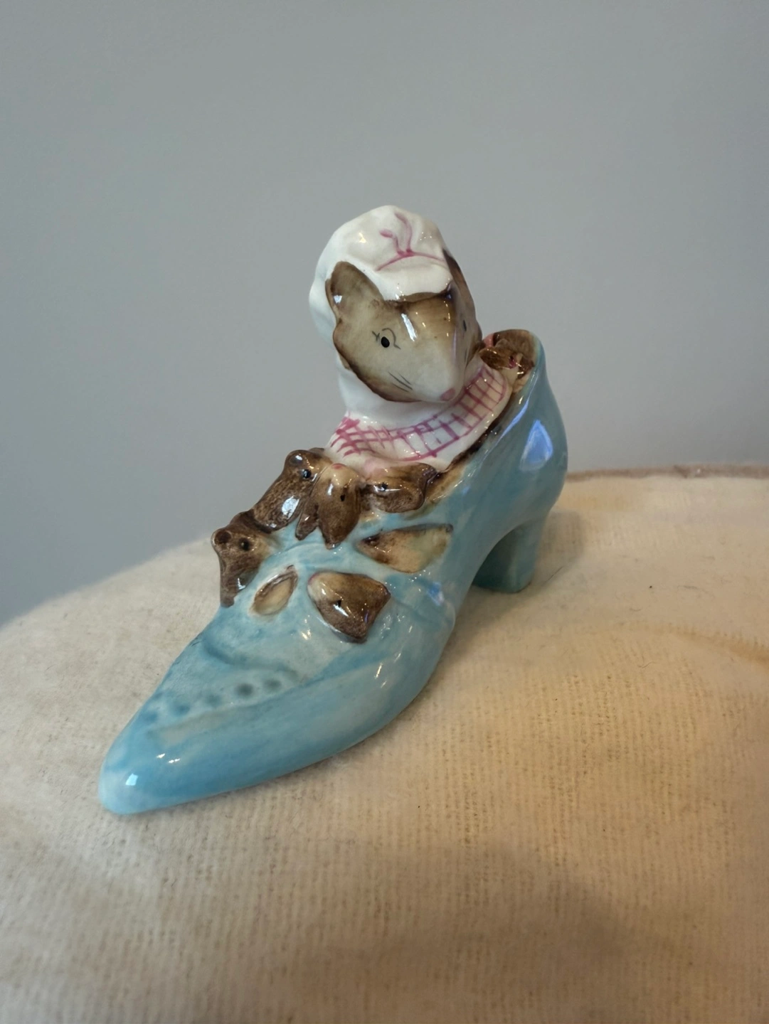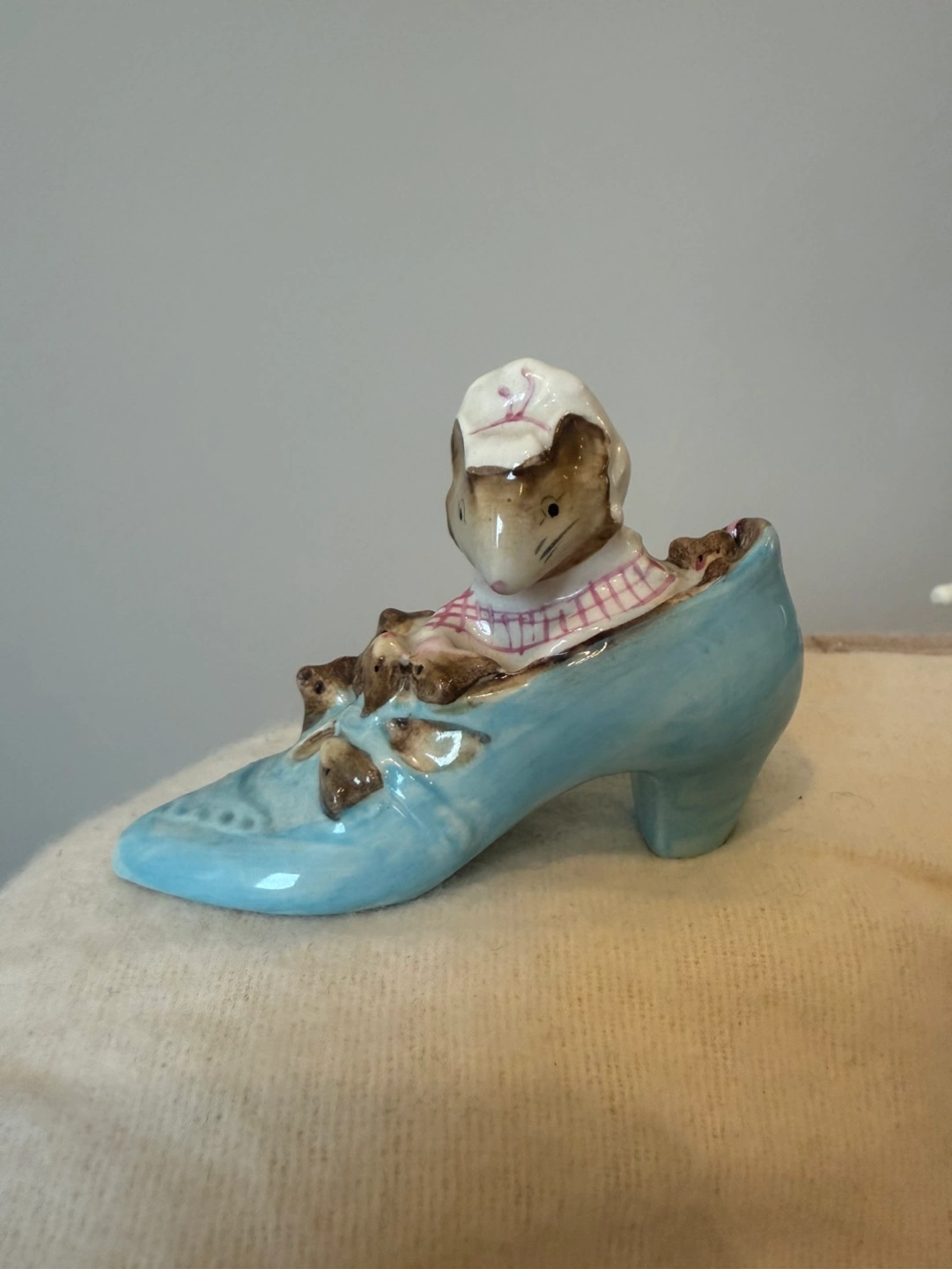 Adorable vintage figurine. Features a mouse in a blue shoe. Small and collectible. Great for a shelf or display.