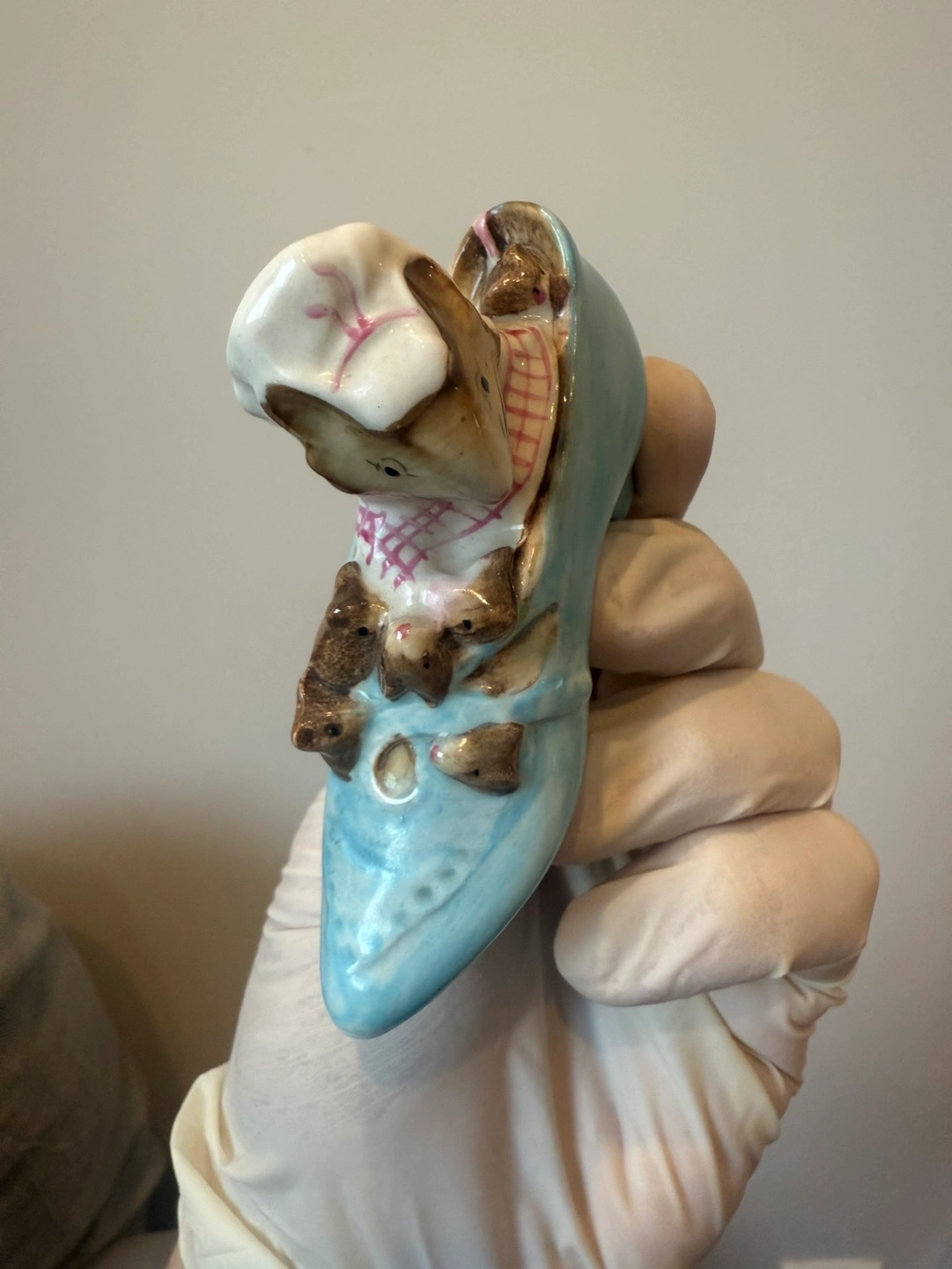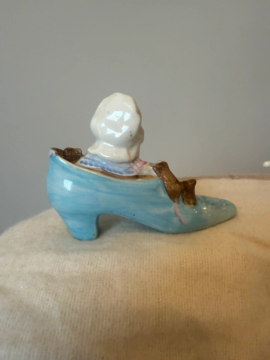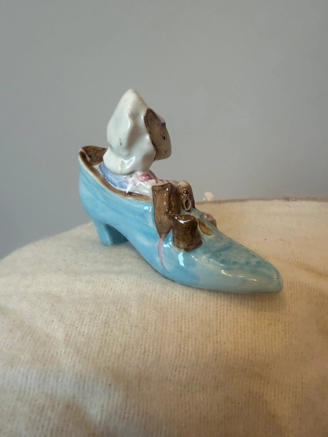 Adorable vintage figurine. Features a mouse in a blue shoe. Small and collectible. Great for a shelf or display.
