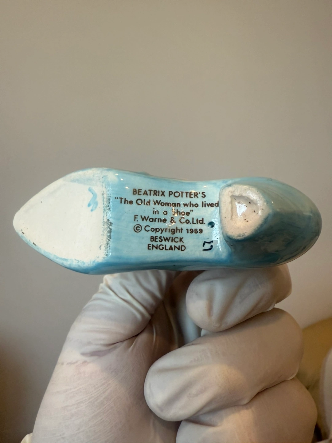 This vintage figurine from Beatrix Potter's collection features the beloved character the Old Woman who lives in a shoe.