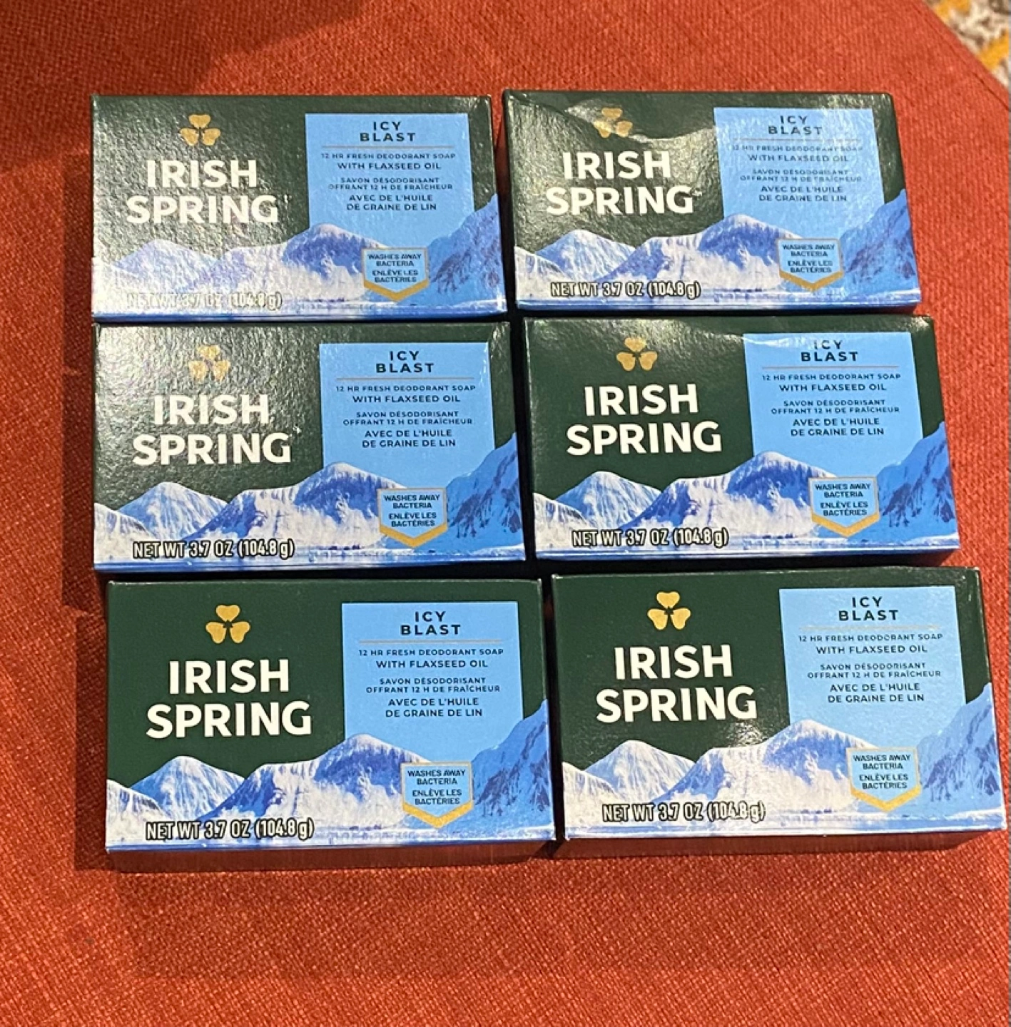 228Six bars of Irish Spring Icy Blast deodorant soap. 12-hour fresh scent, flaxseed oil. Washes away bacteria.