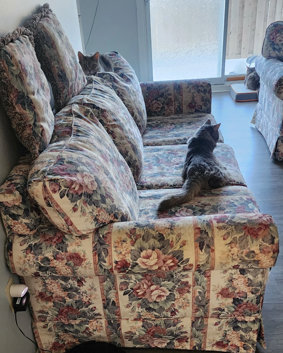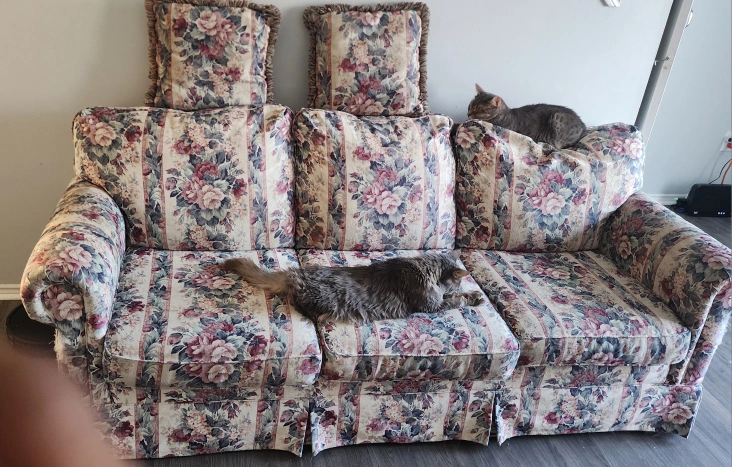 Matching floral 3 seater sofa and armchair. Cream coloured base with pink and green floral pattern. Cats not included. Some wear and tear, but kept clean by a professional cleaner. Includes two cushions. Pick up near limeridge. Price Firm.