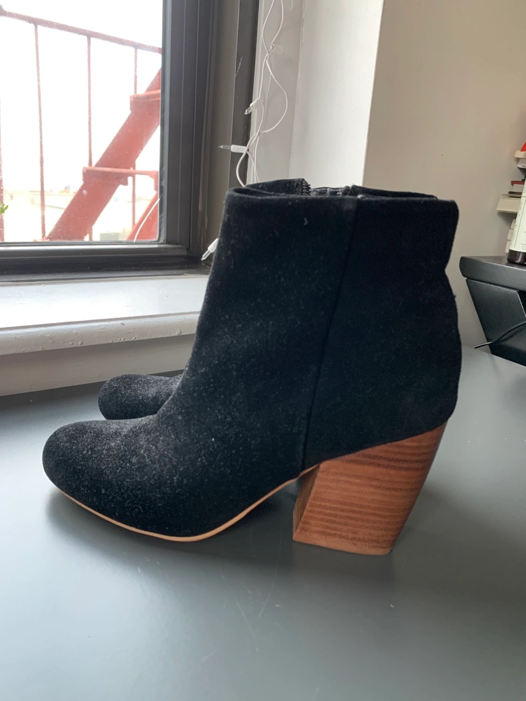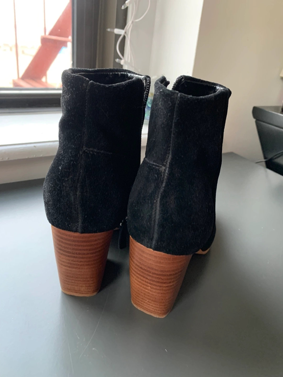 Women's black genuine suede ankle boots. Block wooden heels. Side zipper closure. Super stylish and comfortable.