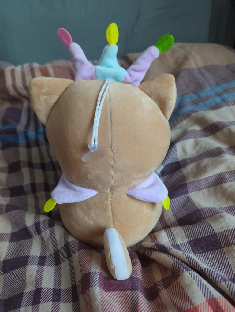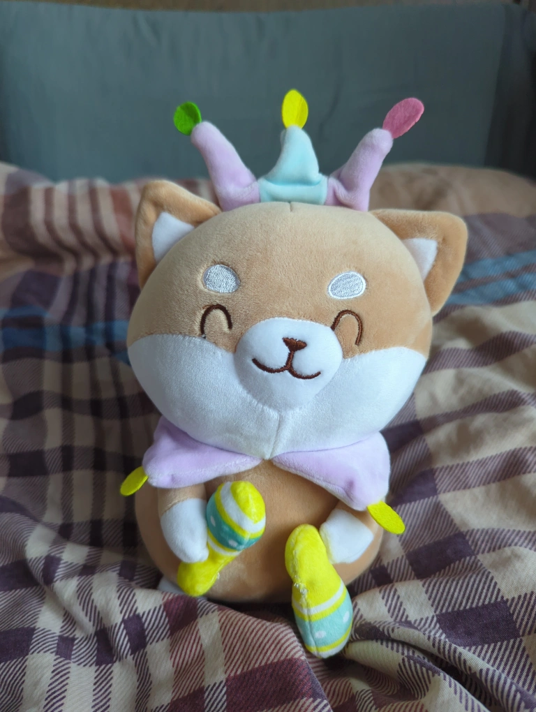 Cute plush toy. Shiba Inu design. Wearing a jester costume. Soft and cuddly. Perfect for collectors or children.
